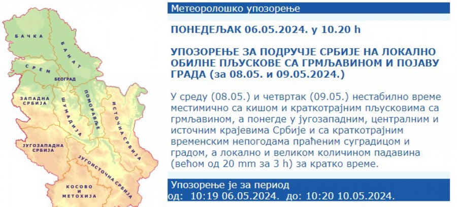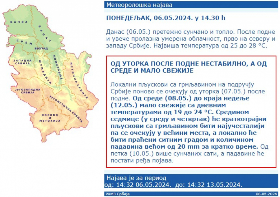U sredu (08.05.) i četvrtak (09.05.) nestabilno vreme mestimično sa kišom i kratkotrajnim pljuskovima sa grmljavinom, a ponegde u jugozapadnim, centralnim i istočnim krajevima Srbije i sa kratkotrajnim vremenskim nepogodama praćenim sugradicom i gradom, a lokalno i velikom količinom padavina (većom od 20 mm za 3 h) za kratko vreme.
