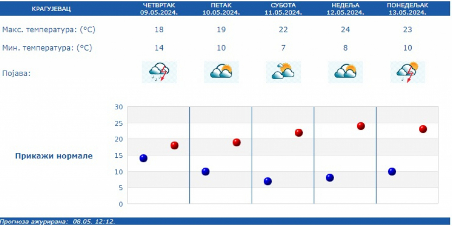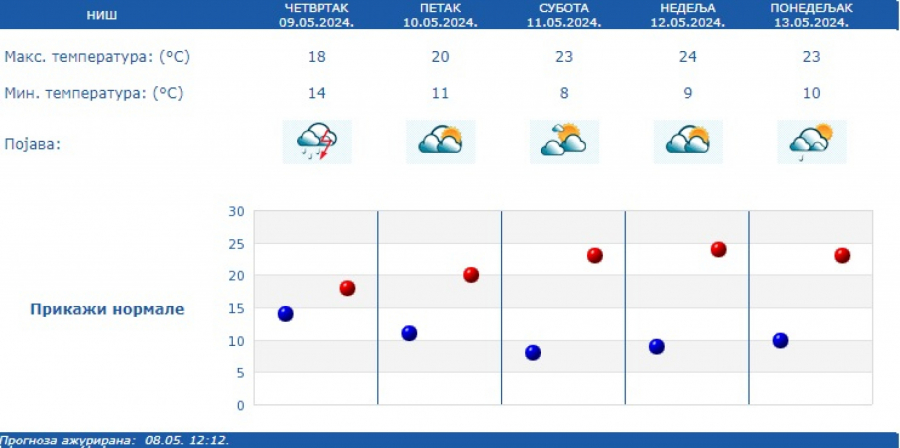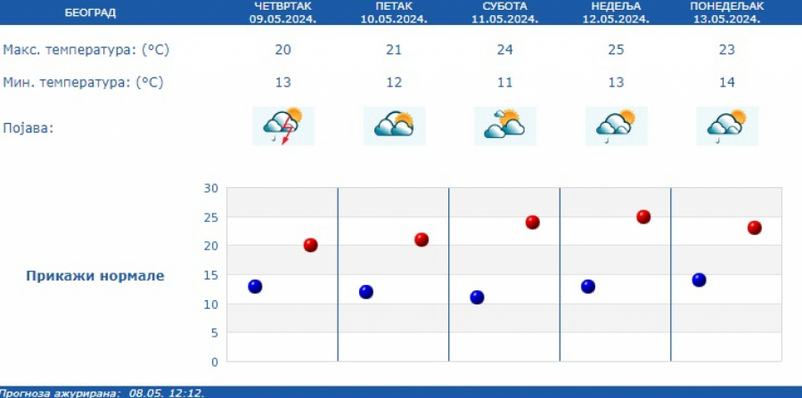 Prognoza predviđa od 20 do 40 milimetara padavina. Jutarnja temperatura biće od 11 do 15, a najviša od 17 na jugu do 22 stepena Celzijusa na severu Vojvodine, prema RHMZ.