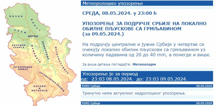 Kako stoji u upozorenju RHMZ od 23 časa, na području centralne i južne Srbije u četvrtak se očekuju lokalno obilni pljuskovi sa grmljavinom uz količinu padavina od 20 do 40 mm, a ponegde i više.