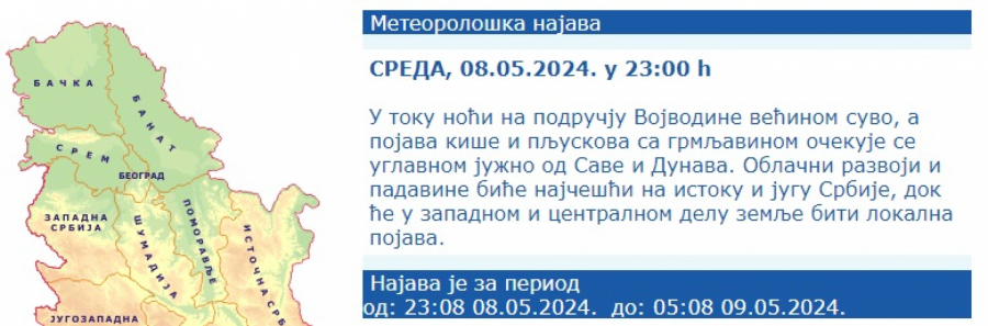 U toku noći na području Vojvodine većinom suvo, a pojava kiše i pljuskova sa grmljavinom očekuje se uglavnom južno od Save i Dunava. Oblačni razvoji i padavine biće najčešći na istoku i jugu Srbije, dok će u zapadnom i centralnom delu zemlje biti lokalna pojava, upozorava RHMZ.