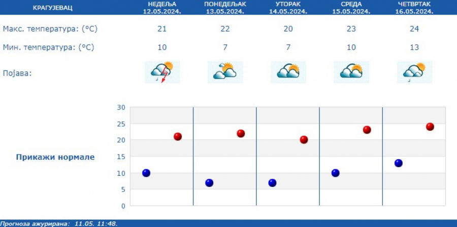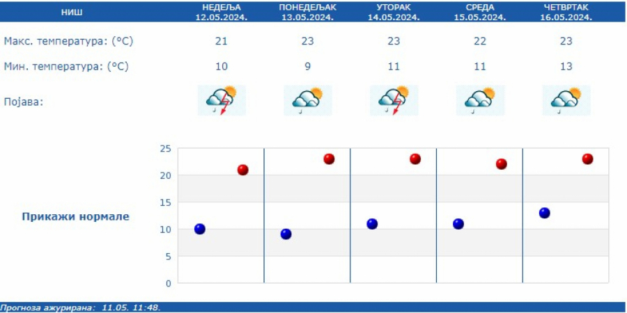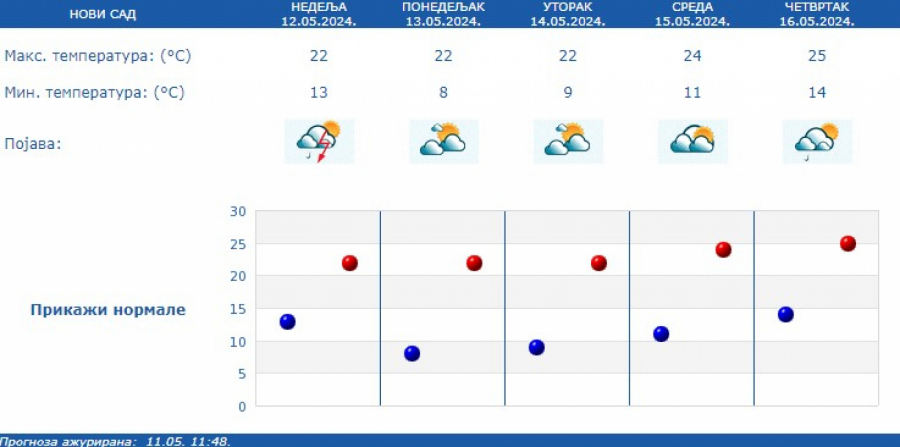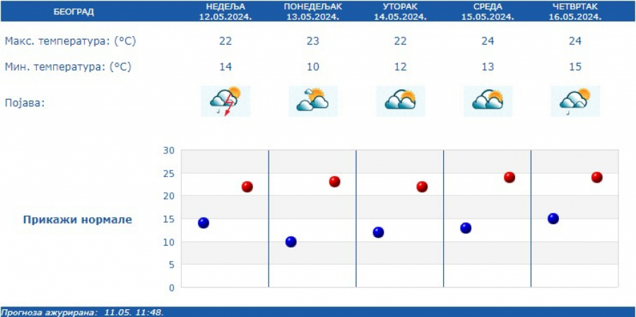 Jutarnja temperatura biće od 5 stepeni na jugoistoku i istoku zemlje do 14 °C u Beogradu, a najviša dnevna od 20 do 23 °C.