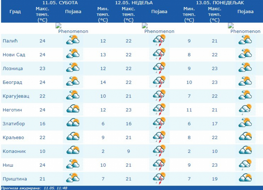 Zatim će biti promenljivo oblačno vreme sa sunčanim intervalima. Kiša i lokalni pljuskovi sa grmljavinom u utorak i sredu mestimično se očekuju na zapadu i jugu naše zemlje, a u drugoj polovini sedmice ponegde i u ostalim predelima.