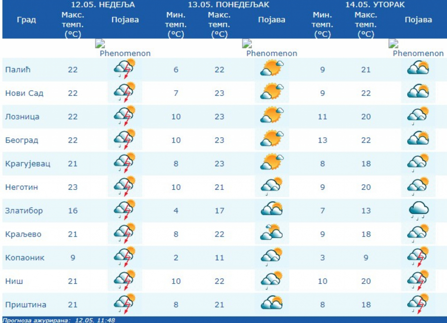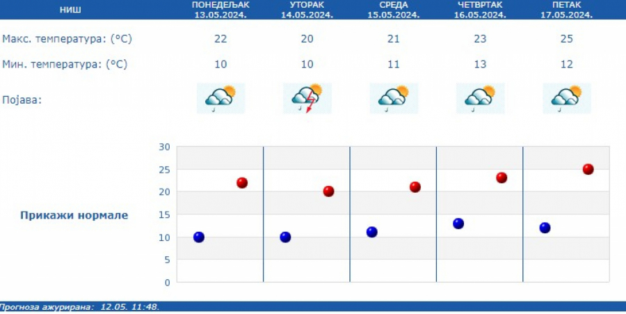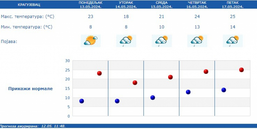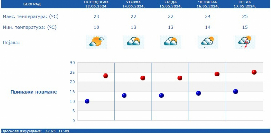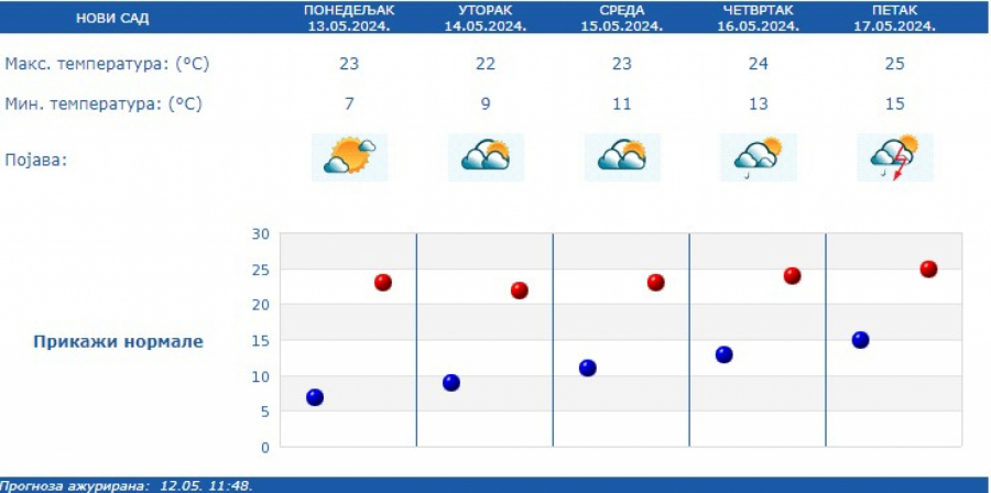 Prema izgledima vremena za narednih sedam dana, do ponedeljka, 20. maja, promenljivo oblačno sa sunčanim intervalima.