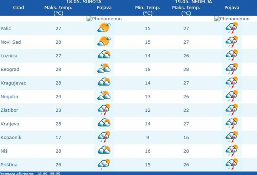 Oblačni sistem koji će se kasnije večeras i noćas premeštati preko južnih i delom centralnih krajeva Srbije ne očekuje se da bude intenzivan (prosečno 5 - 15 mm), ali se zato sutra posle podne i uveče očekuje dodatna destabilizacija atmosfere uz potencijalno jače grmlјavinske oblake i lokalno veću količinu padavina (20 - 40 mm), naročito u centralnoj i južnoj Srbiji u toku noći između nedelјe i ponedelјka. Najmanja verovatnoća za pojavu nepogoda sutra će biti na severozapadu Srbije - najavio je RHMZ.