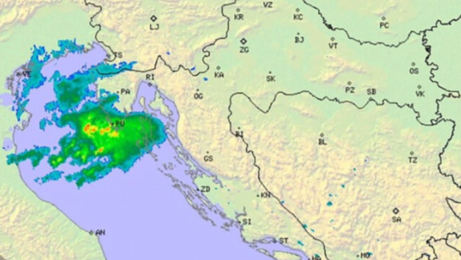 Grmljavinsko nevreme na severnom Jadranu približava se brzinom od 50 do 60 km/h obali Istre. Slika meteorološkog radara DHMZ-a ukazuje na velike količine padavina koje će pasti.