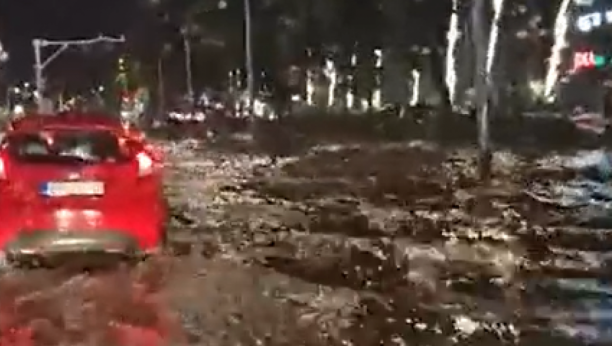 Ulica je praktično prekrivena vodom, dok se vozila jedva kreću.