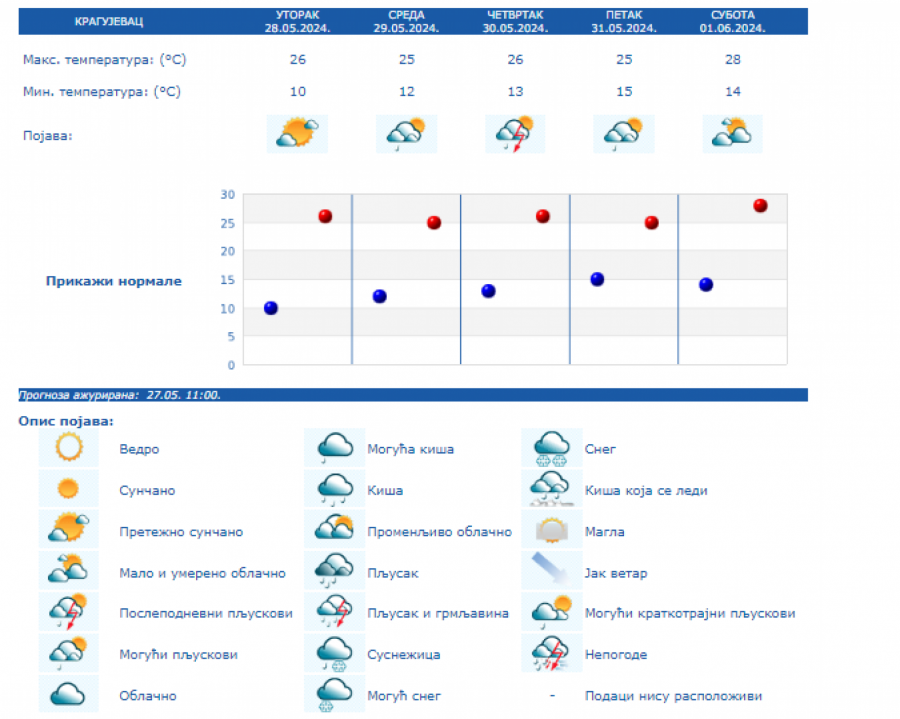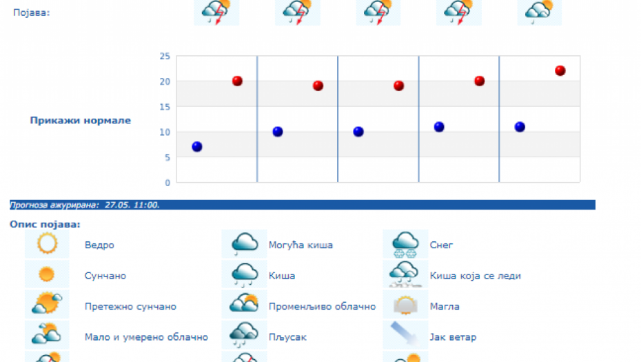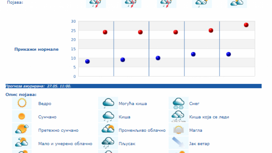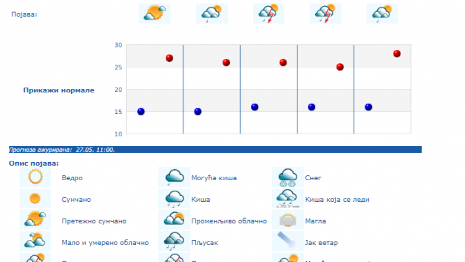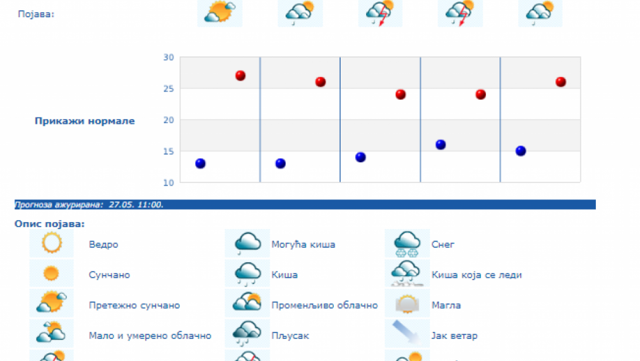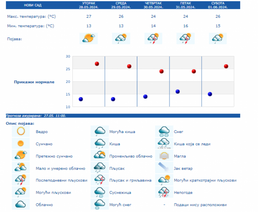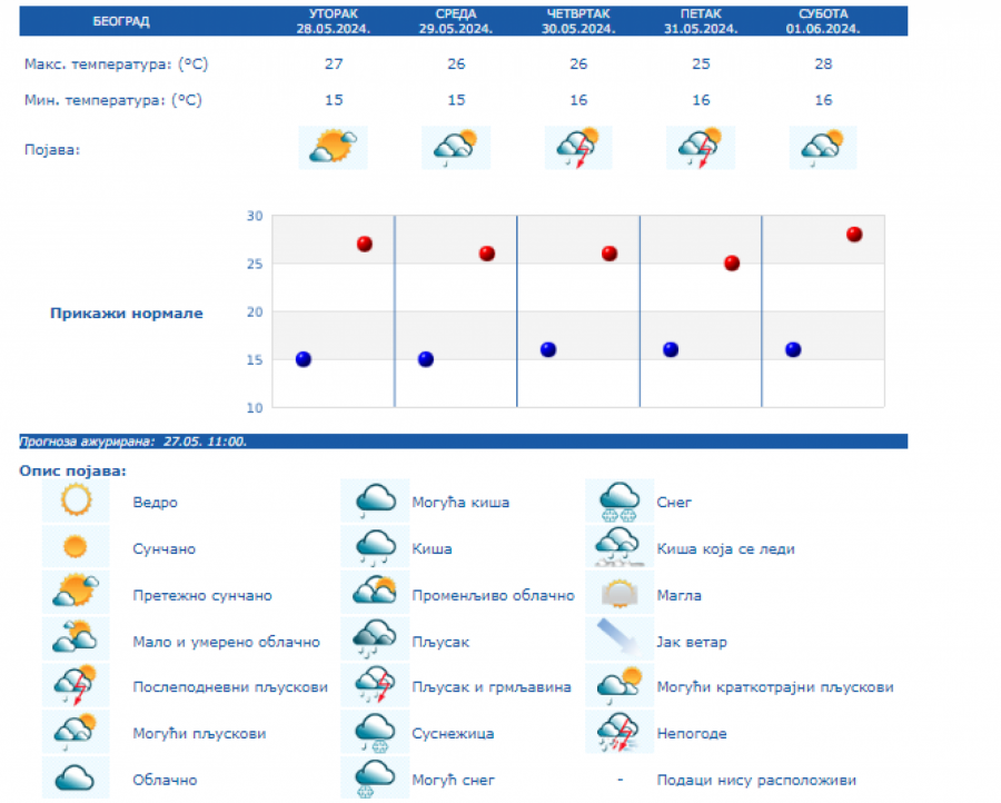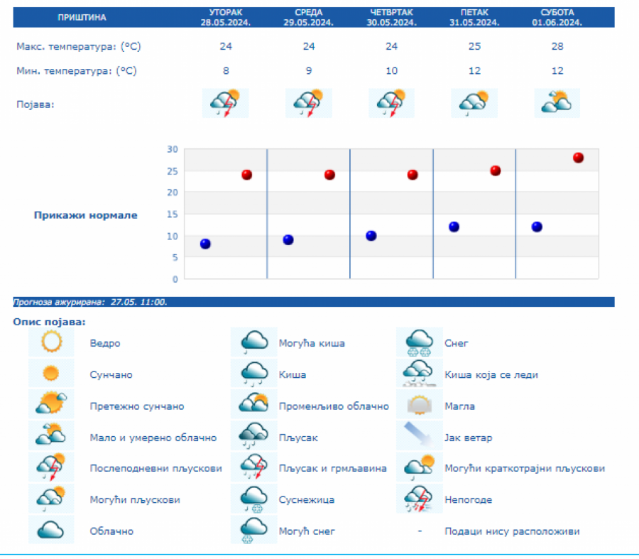 Vetar uglavnom slab, promenljiv. Najniža temperatura od 10 do 15, najviša oko 27 stepeni Celzijusovih. U Srbiji sledećih sedam dana promenljivo oblačno sa sunčanim intervalima, ali nestabilno, pa će ponovo biti uslova za pljuskove sa grmljavinom u svim regionima.