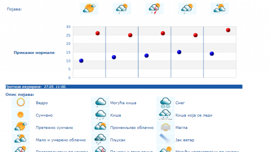 Najviša temperatura do kraja maja u većini mesta od 24 do 27, a početkom juna u porastu, od 27 na severozapadu do 32 stepena na jugoistoku Srbije.