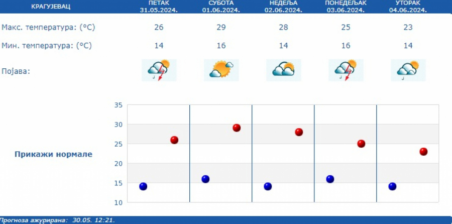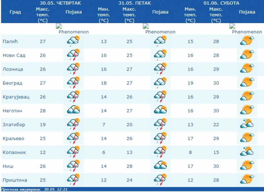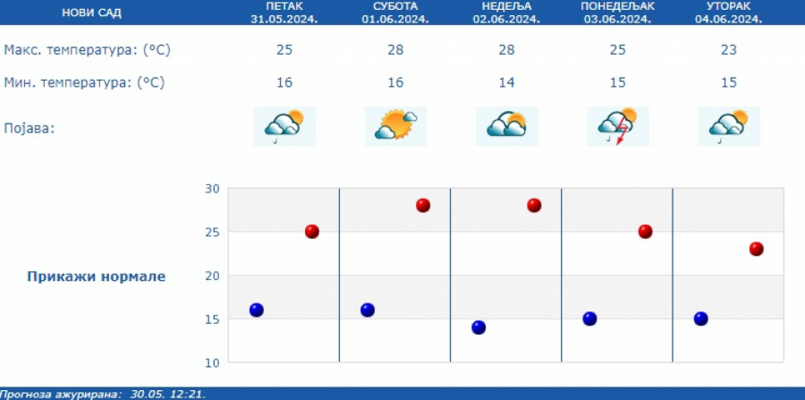 U subotu će biti pretežno sunčano i toplo. Zatim se očekuje promenljivo i nestabilno vreme sa uslovima za lokalne pljuskove sa grmljavinom u brdsko-planinskim predelima, osim u ponedeljak i utorak kada se padavine očekuju u većem delu zemlje.