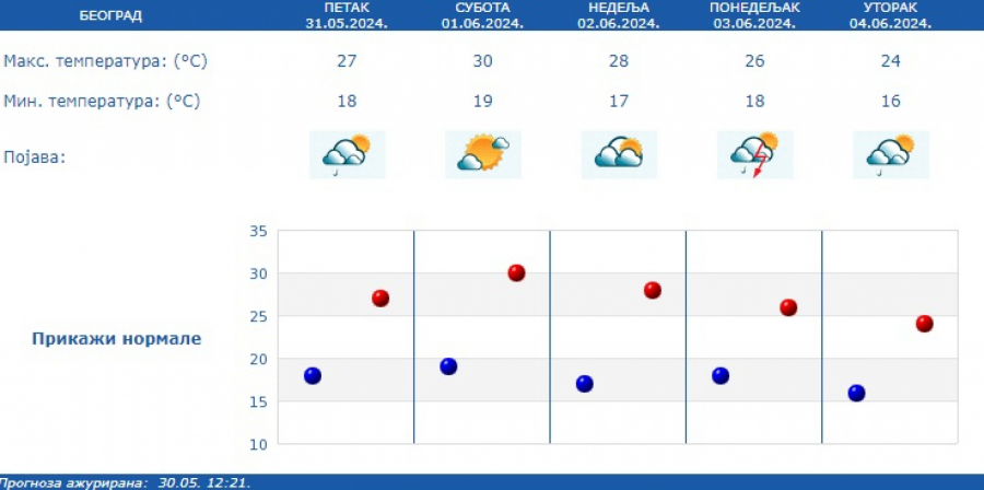 Duvaće slab i umeren južni vetar. Jutarnja temperatura biće oko 18 °C, a najviša dnevna oko 27 °C.