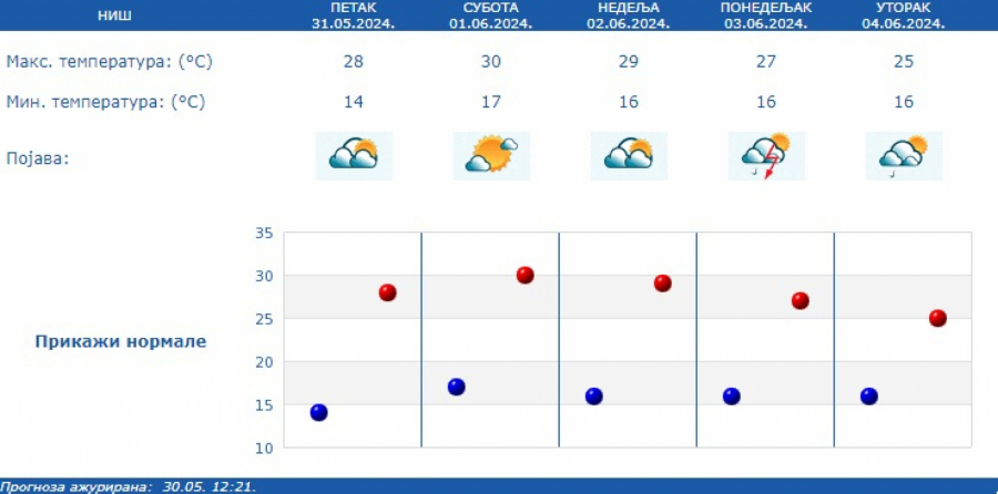 Duvaće slab i umeren vetar, južni i jugozapadni. Jutarnja temperatura biće od 11 do 18 °C, a najviša dnevna od 24 do 28 °C.