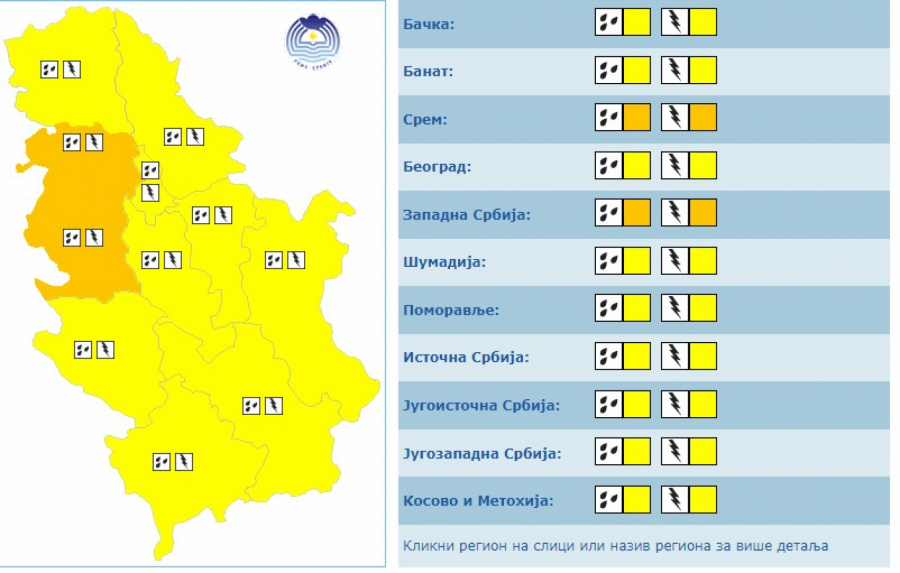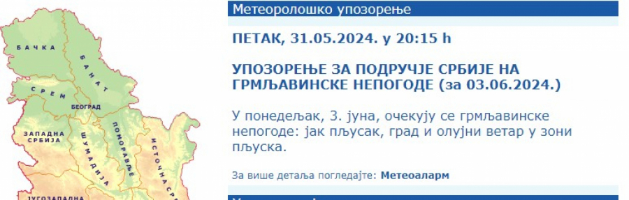 Za 3. jun takođe je u celoj Srbiji aktivan žuti meteoalarm, dok je u Sremu i Zapadnoj Srbiji aktivan narandžasti.