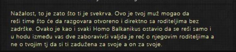 Izbečila se i kao “treba da te je sramota”, samo sam se nasmejala i rekla “treba Vas da je sramota da od mene tako nešto tražite, jer kad je meni trebalo par sati pomoći nikada niste hteli”. Dobro se nije šlogirala. Al šta ću joj ja… Gadno je to kad si samoživ", napisala je snajka posle čega su ljudi počeli da joj pišu - i snaje i svekrve!