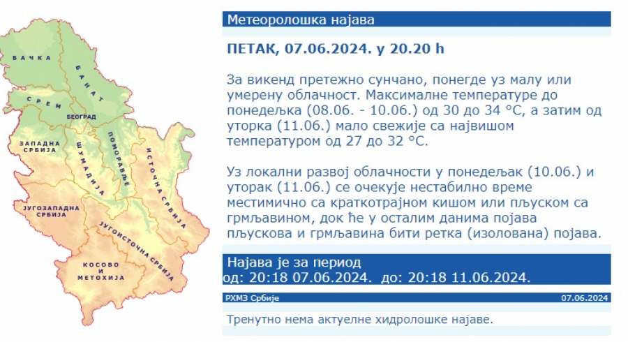 Posle podne u brdsko-planinskim predelima jugozapadne i južne Srbije i na krajnjem severu Vojvodine, uz izolovani razvoj oblačnosti, retka pojava kratkotrajne kiše ili pljuska sa grmljavinom.