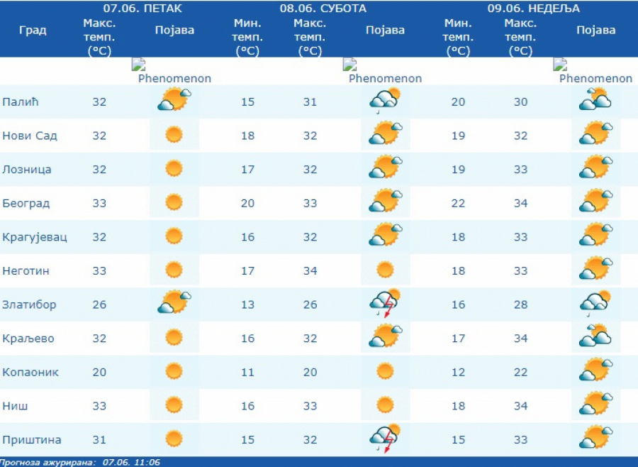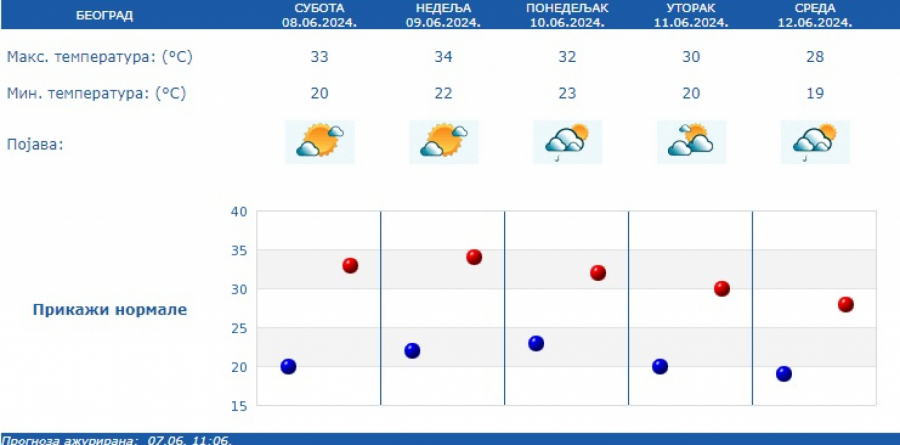 Maksimalne temperature do ponedeljka u intervalu od 30 do 34 stepena, a od utorka malo svezije sa najvisom temperaturom od 27 do 32 stepena Celzijusa.