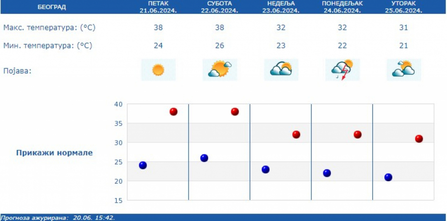 U većini krajeva pretežno sunčano i veoma toplo, a uz lokalni razvoj oblačnosti, očekuje se retka (izolovana) pojava kratkotrajnih pljuskova sa grmljavinom. Vetar slab, promenljiv. Najniža temperatura od 18 do 23, a najviša od 31 na severozapadu do 38 stepeni na istoku i jugu Srbije.