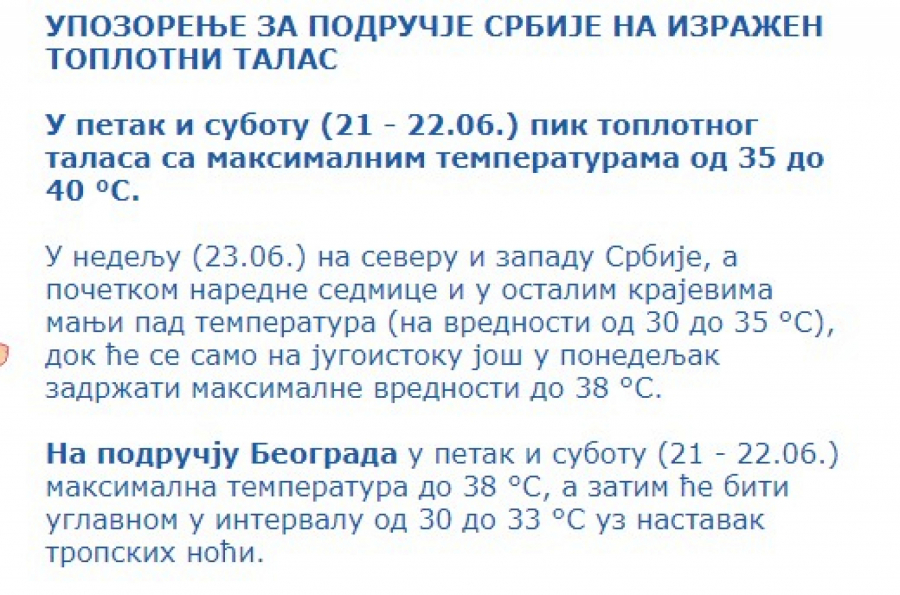 U petak i subotu biće vrelih 40 stepeni u hladu. I danas pretežno sunčano i veoma toplo. Na snazi je i crveni meteoalarm, u većem delu zemlje.