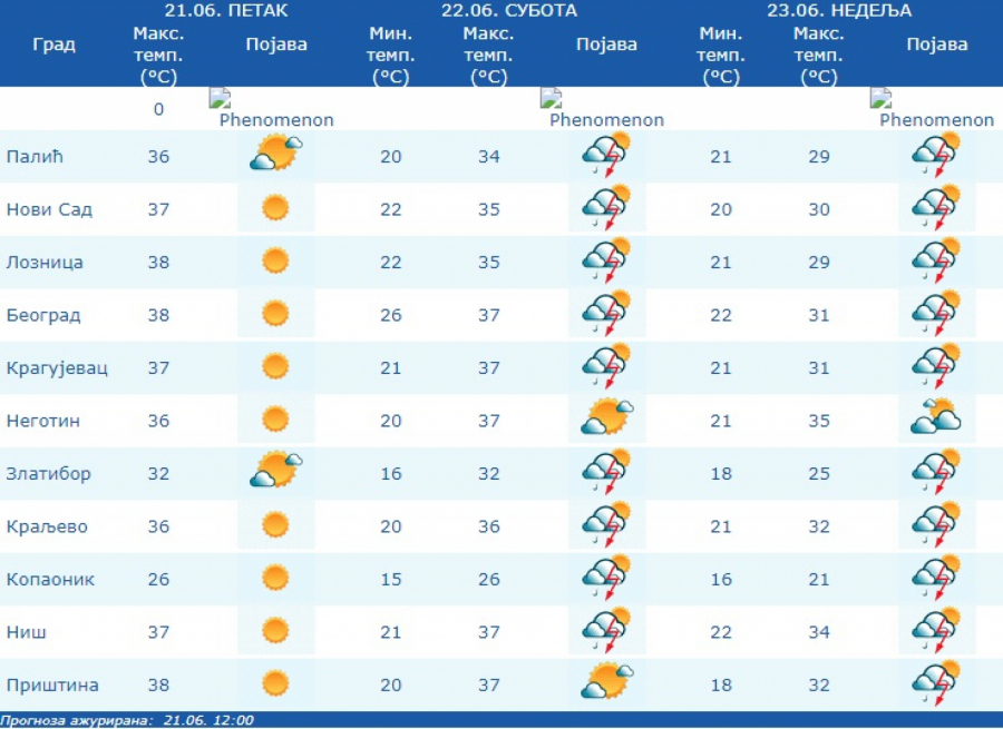 Duvaće slab promenljiv vetar, u košavskom području umeren, a na jugu Banata i u donjem Podunavlju povremeno i jak jugoistočni, dok će se temperature kretati od 19 do 40 stepeni.