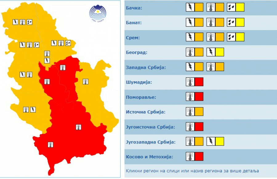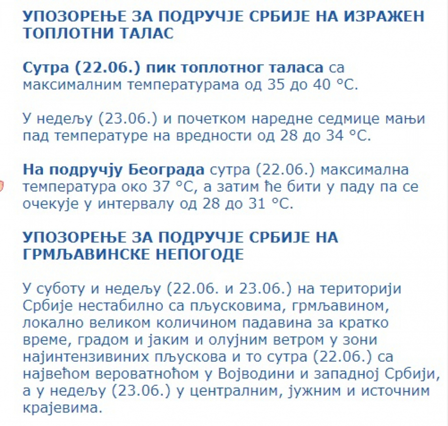 Od sredine dana na severu i zapadu, a posle podne i uveče i u ostalim krajevima moguća je lokalna pojava pljuskova sa grmljavinom, koja na području Vojvodine i zapadne Srbije može biti praćena i grmljavinskim nepogodama.