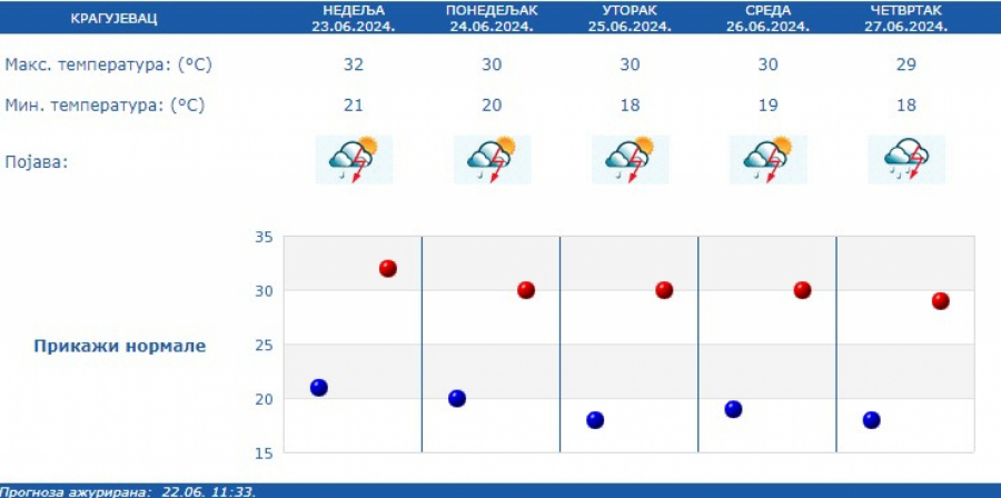 Van grmljavinskih razvoja, vetar će biti u skretanju na slab i umeren, severozapadni. Najniža temperatura od 18 do 23, a najviša od 30 na severu i zapadu Srbije do 36 stepeni na istoku i jugoistoku zemlje.