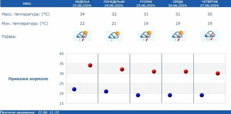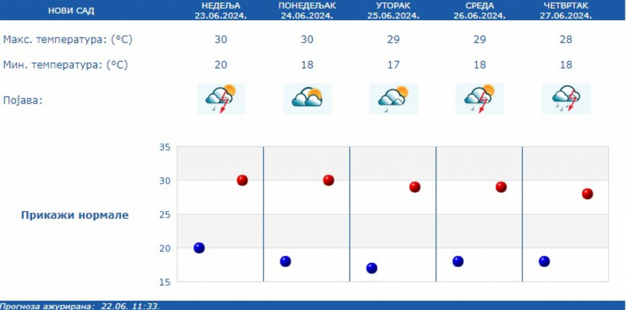 Promenljivo oblačno, toplo, sparno i nestabilno sa sunčanim intervalima, ali i sa pljuskovima i grmljavinom, koji na jugu Srbije ponegde mogu biti praćeni gradom. Vetar slab i umeren, severozapadni. Najniža temperatura od 17 do 23, a najviša od 28 do 35 stepeni.