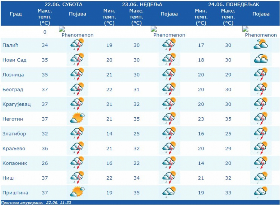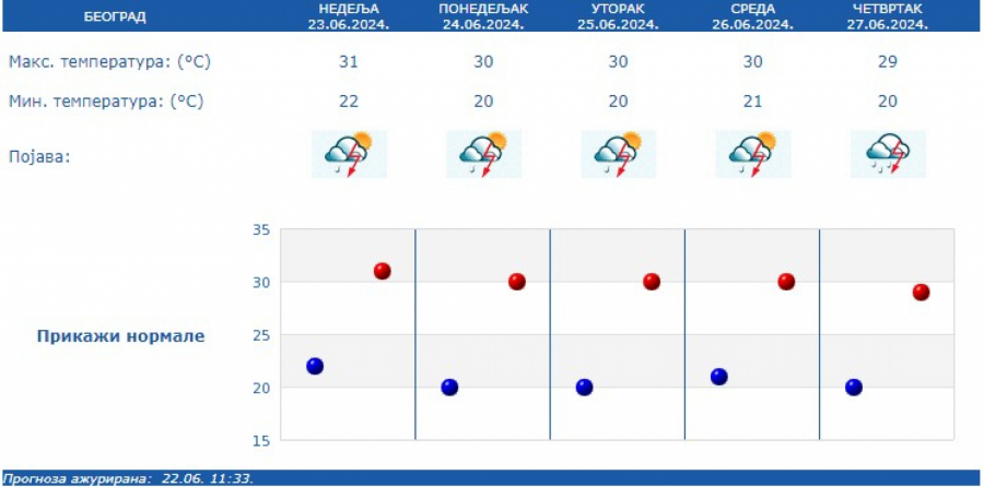 Jutarnja temperautra od 18 do 23 stepena, najviša dnevna do 36. U glavnom gradu biće uslova za nepogode, dok će u najtoplijem delu dana biti 31 stepen.