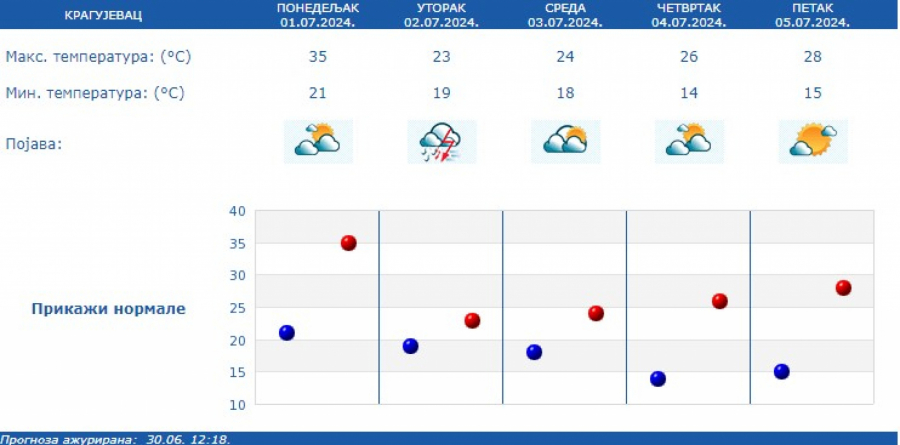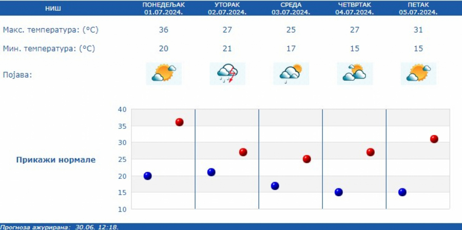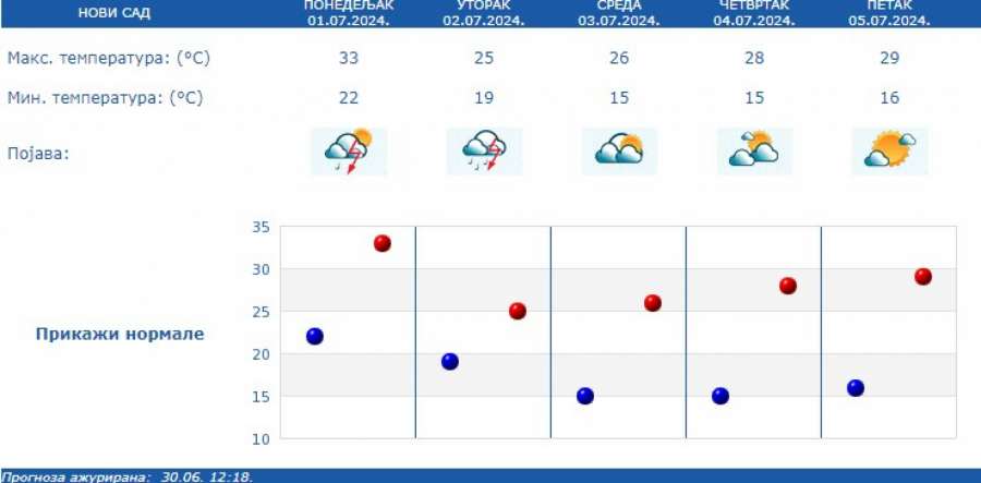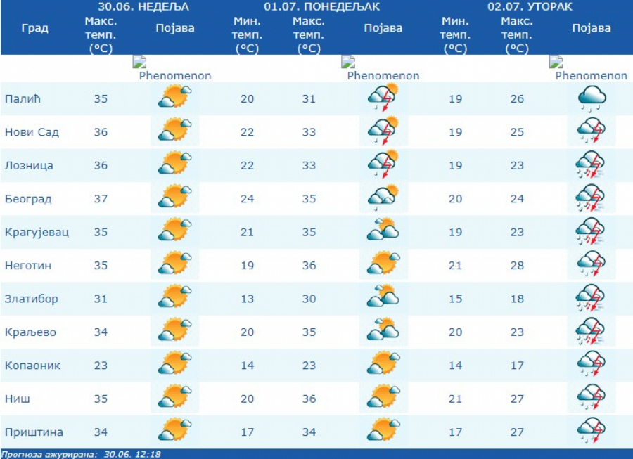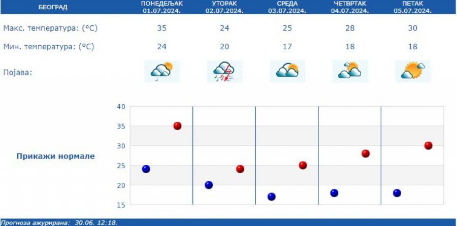 U Beogradu pretežno sunčano a kasno posle podne i uveče kiša i pljuskovi. Najviša temperautra 35 stepeni. Već u utorak 10 stepeni svežije.