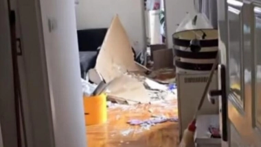 Na snimku se vidi da je čitav plafon pao i da izolacija visi a da je na patosu krš i lom koji ukućani pokušavaju da počiste i saniraju.