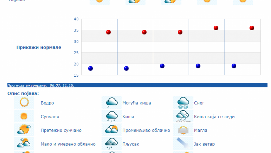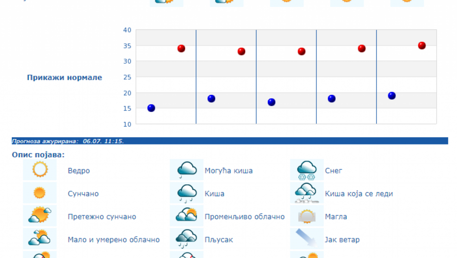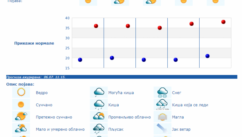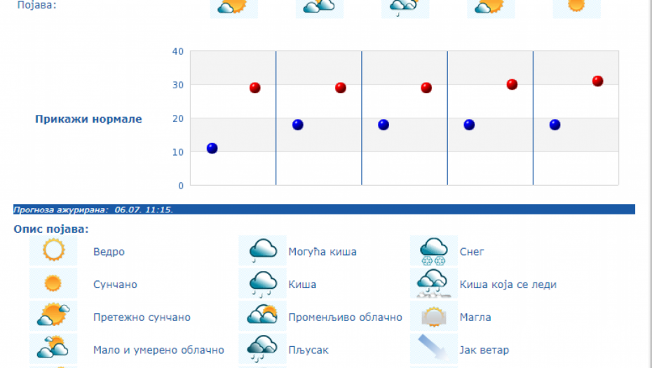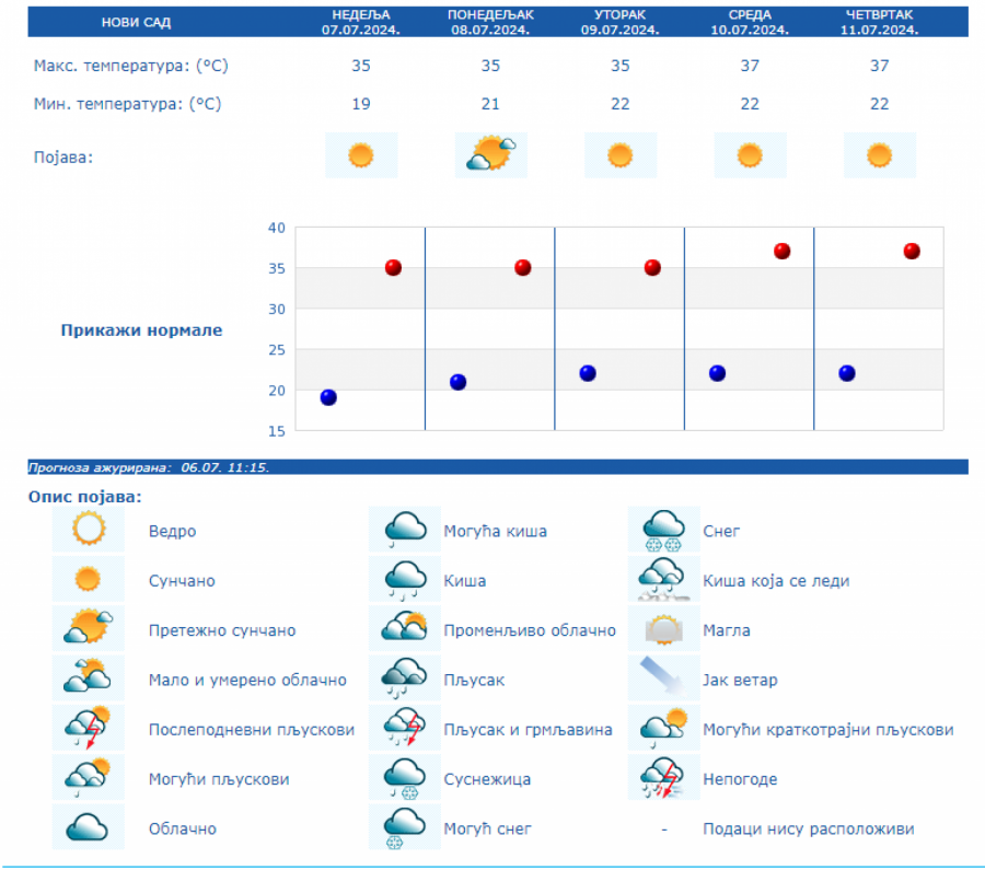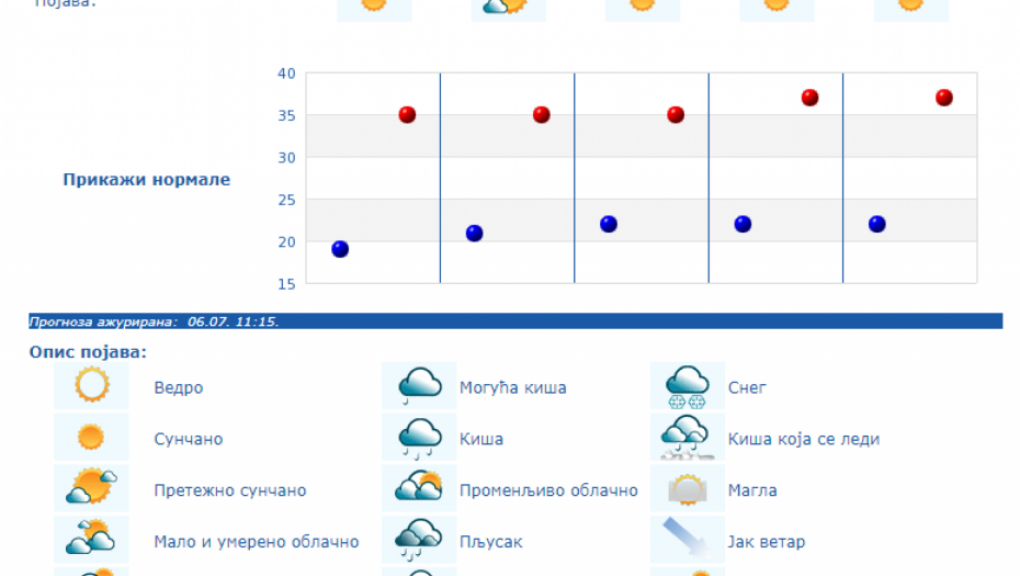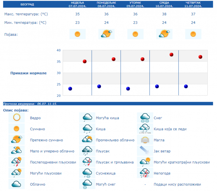 Vrednosti maksimalne temperature sutra (07.07.) od 32 do 36 °S, a sledeće sedmice (08-14.07.) u većini mesta od 34 do 38 °S, uz tropske noći u urbanim sredinama - najavljuje RHMZ.