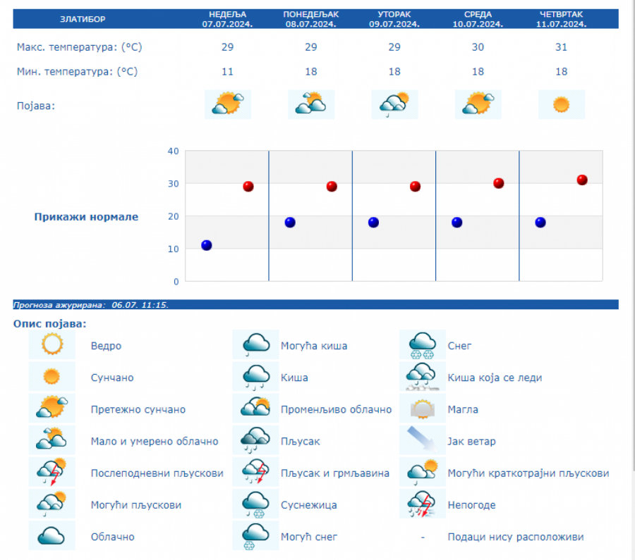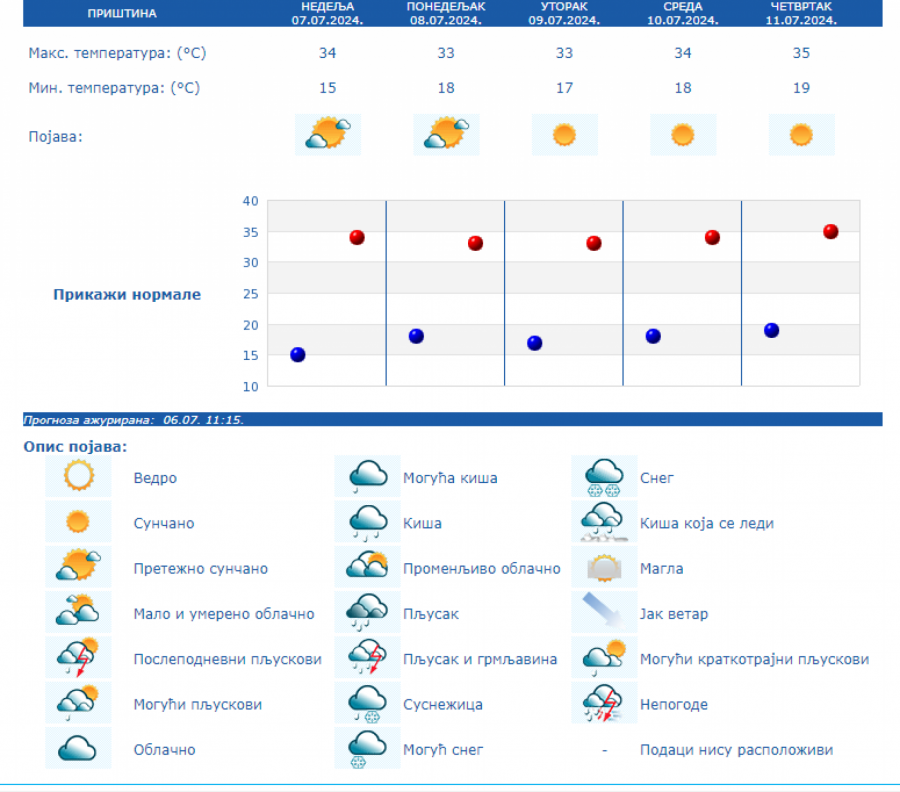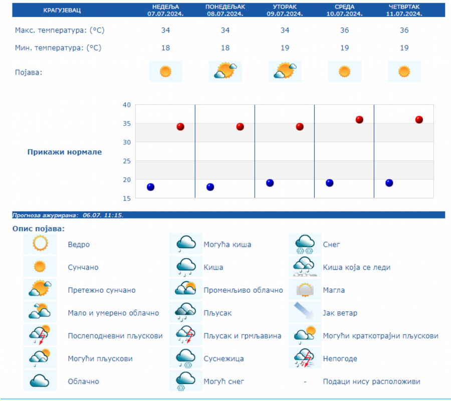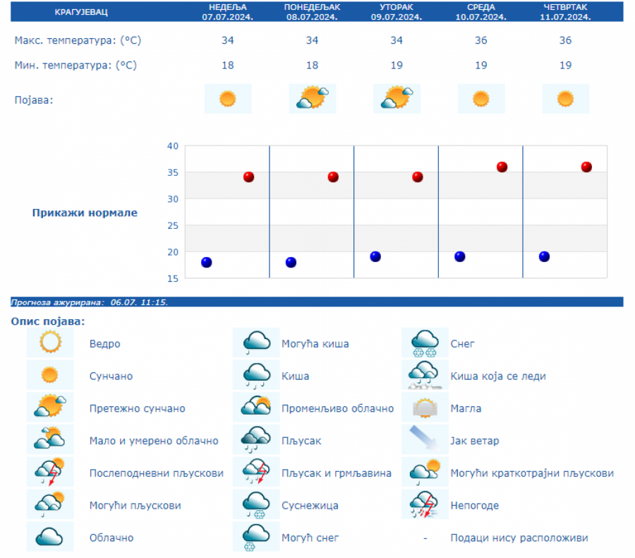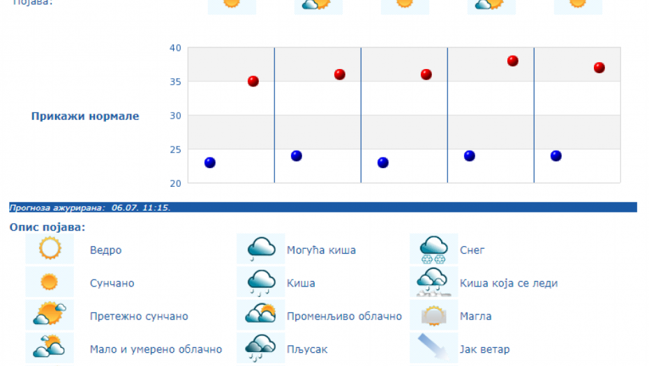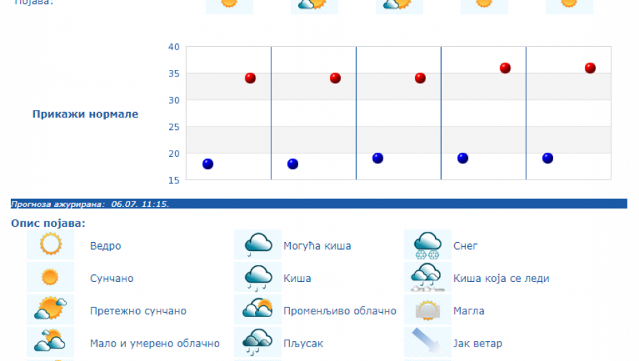Vrednosti maksimalne temperature sutra (07.07.) od 32 do 36 °S, a sledeće sedmice (08-14.07.) u većini mesta od 34 do 38 °S, uz tropske noći u urbanim sredinama - najavljuje RHMZ.