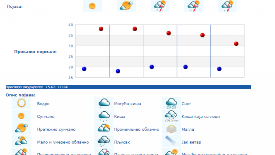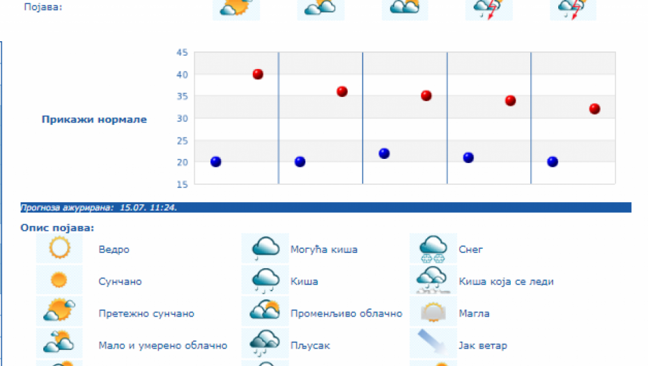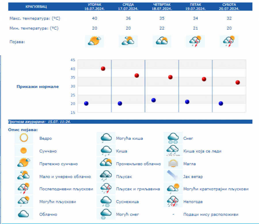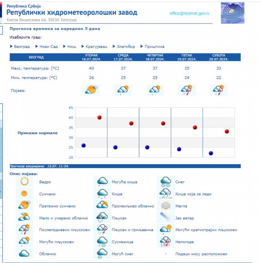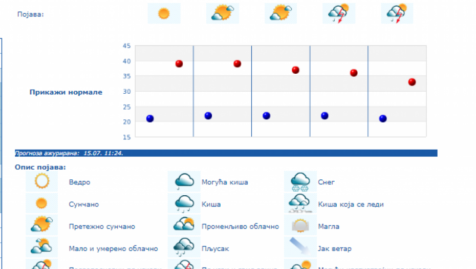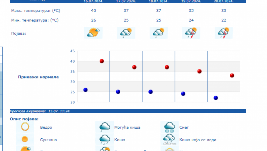 Istovremeno, RHMZ upozorava na veoma izražen toplotni talas, uz deficit padavina, koji se nastavlja i u prvoj polovini ove sedmice, kada će u većini mesta maksimalne temperature biti u intervalu od 35 do 40 stepeni uz tropske noći u urbanim sredinama.