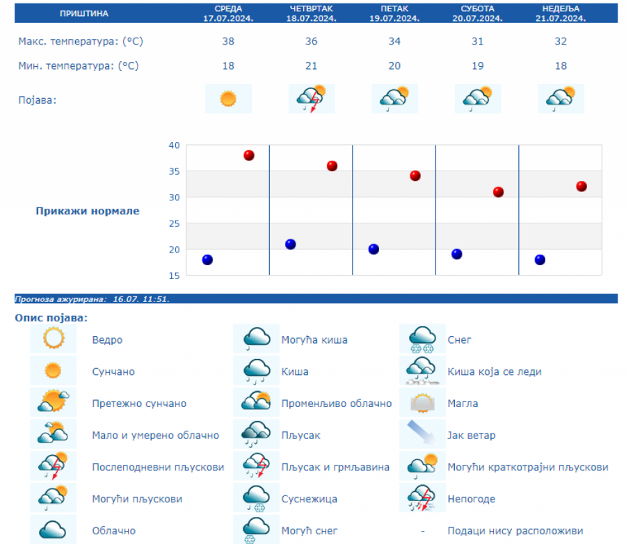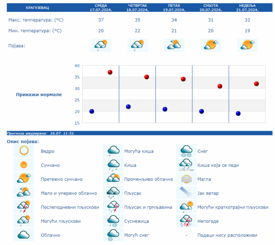 - Zatim do kraja ove sedmice (18-21.07.) postepeni manji pad temperature, pa će se najviše dnevne temperature u većini mesta kretati u intervalu od 32 do 38 °S i uz tropske noći u urbanim sredinama.