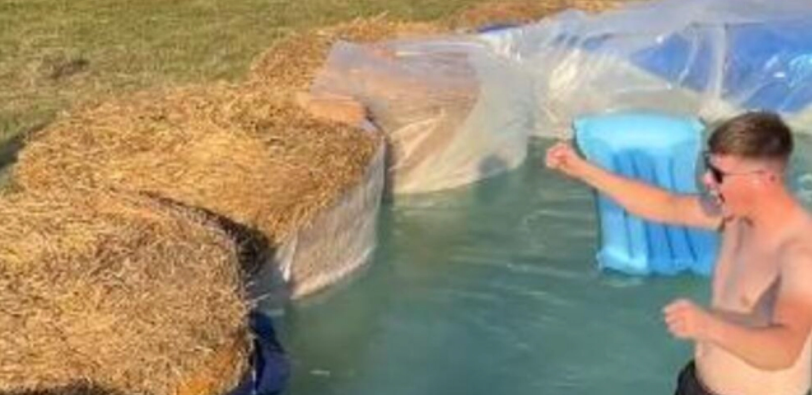 Mladići su, kako se vidi na snimku, bale sena poslagali u krug, praveći ogradu, a u sredinu su stavili najlon koji su pričvrstili ciglama. Improvizovani bazen su napunili vodom.