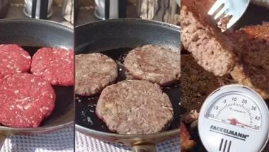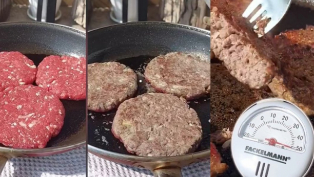 Najpre je, snimio termometar koji je pokazivao više od 50 stepeni, a onda je tiganj postavio na metalni podmetač da se dobro zagreje i nasuo ulje. Posle 20-ak minuta, taman dok je pripremio smesu i oblikovao pljeskavice, ulje se zagrejalo i počeo je s prženjem...
