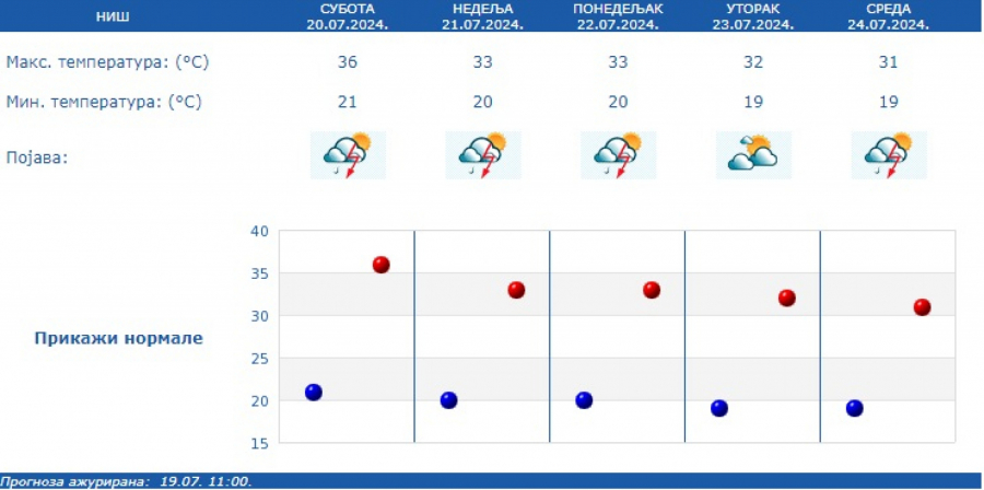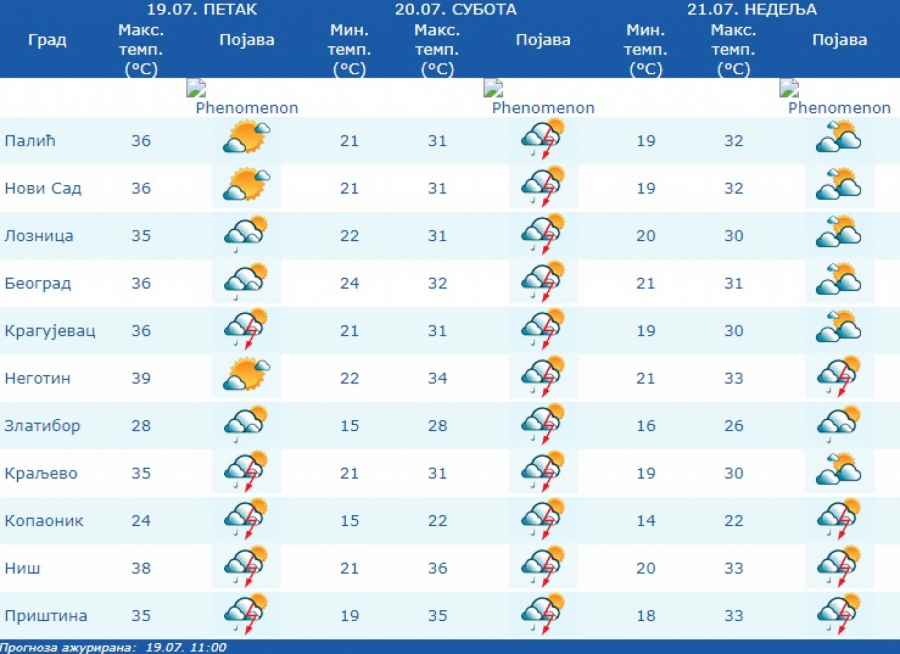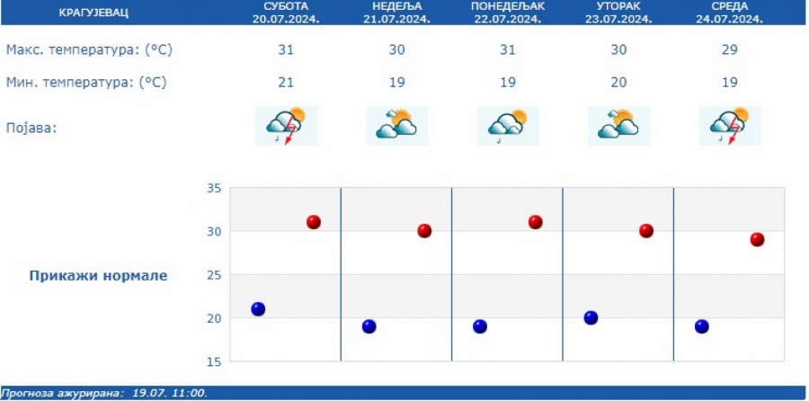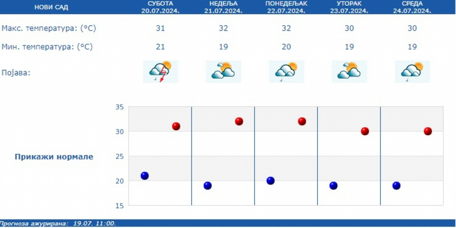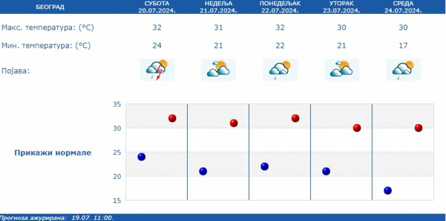 Sa pljuskovima i grmljavinom, češćim posle podne i uveče, koji lokalno mogu biti intenzivniji i praćeni gradom i jakim ili olujnim vetrom.