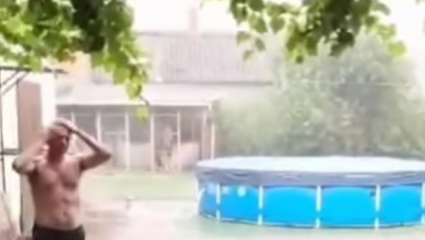 Čitalac 192.rs, Nikola, poslao je snimak iz svog dvorišta u Obrenovcu. Na njemu, može se videti da je montažni bazen prekriven, ali on je rešio da se okupa - na pljusku.