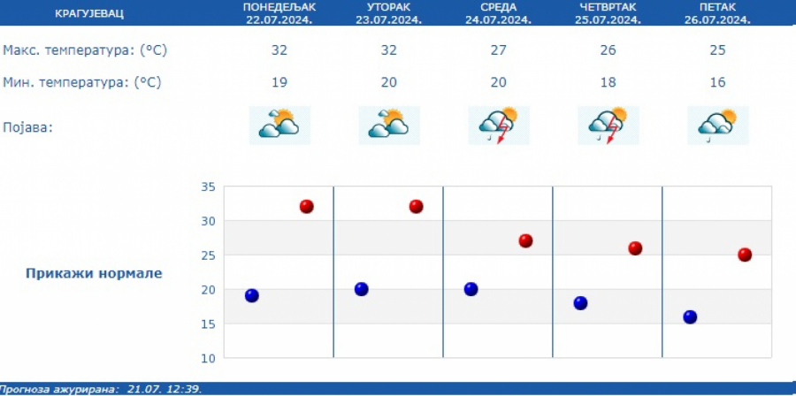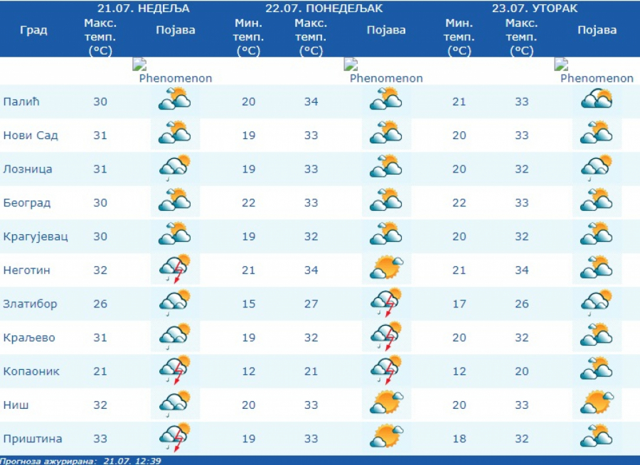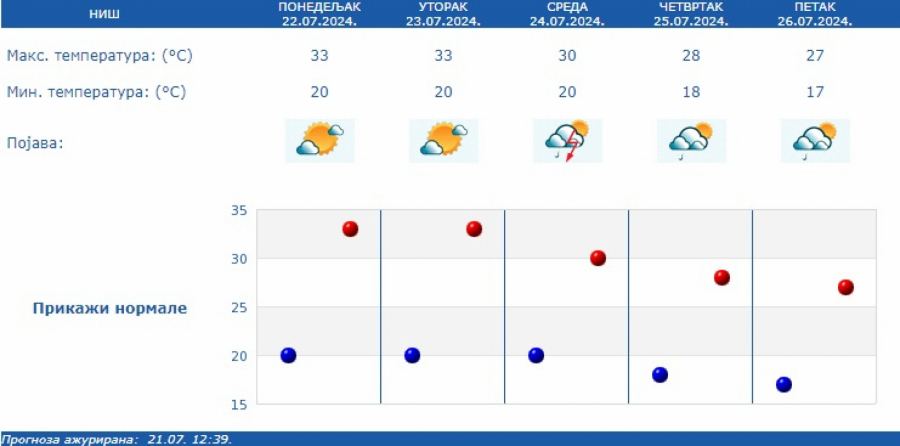 Kratkotrajna kiša ili lokalni pljusak sa grmljavinom očekuje se uglavnom u brdsko-planinskim predelima. Vetar slab i umeren, severozapadni.