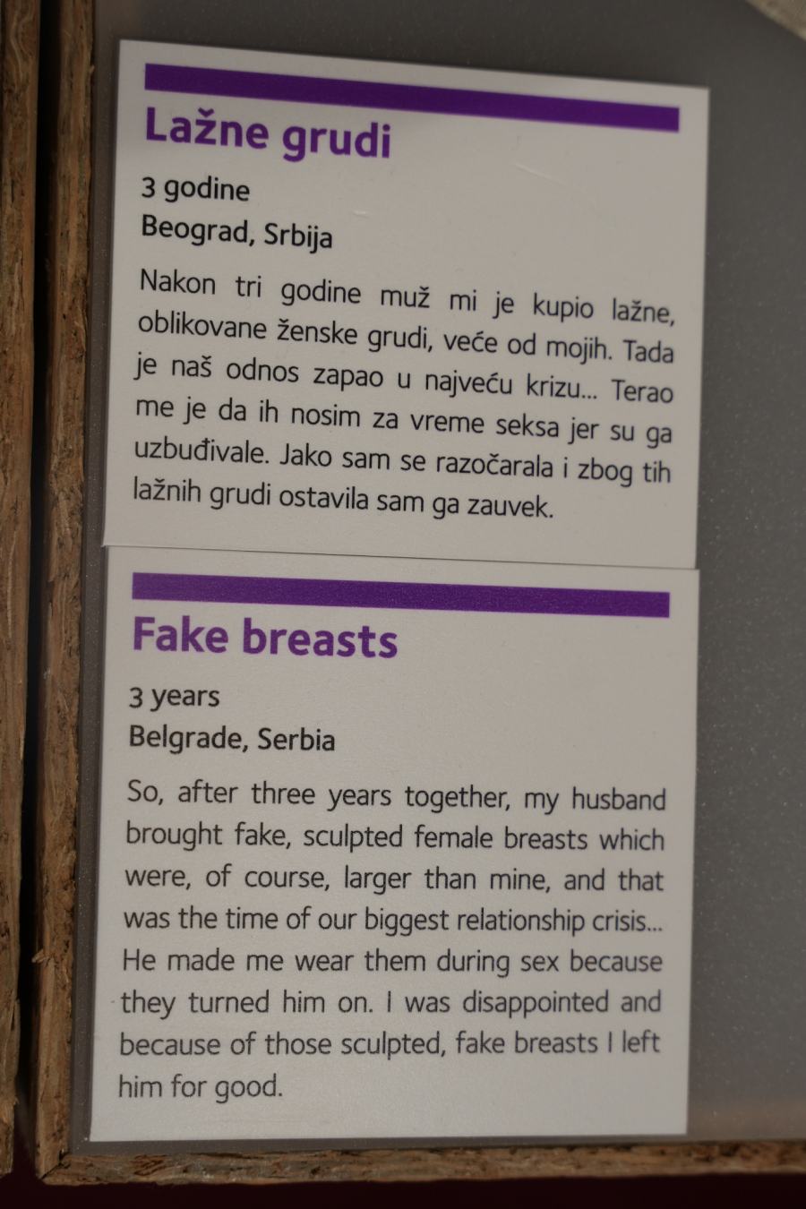 - Kao što ističu osnivači izložbe, Dražen i Olinka, niko nas ne uči kako da se nosimo sa tim. Kao društvo, naučeni smo različitim obrascima, od svadbi i sahrana do proslava mature, ali ne i kako se nositi sa tugom od raskida, pa iz tog razloga Muzej prekinutih veza nudi jedno katarzično iskustvo, kako za donatore eksponata i njihove priče tako i za posetioce - zaključuje ona.