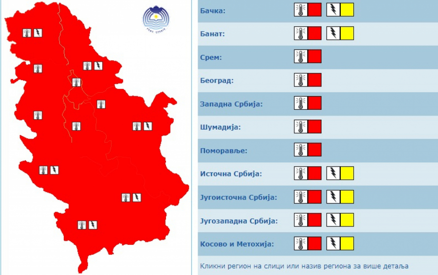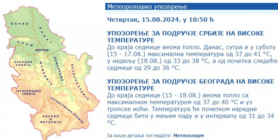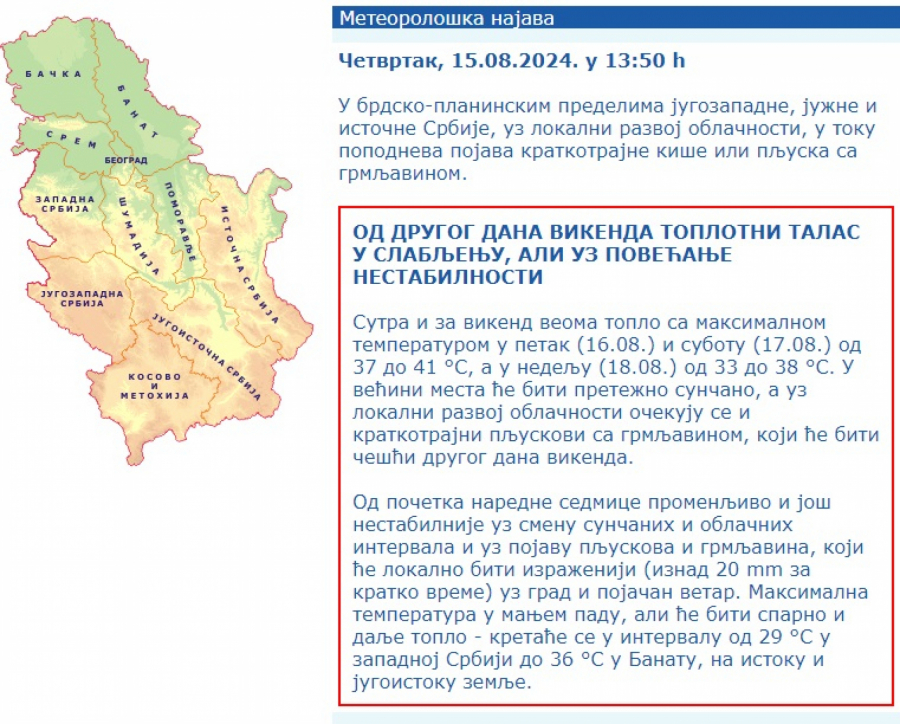- Sutra i za vikend veoma toplo sa maksimalnom temperaturom u petak (16.08.) i subotu (17.08.) od 37 do 41 °C, a u nedelјu (18.08.) od 33 do 38 °C. U većini mesta će biti pretežno sunčano, a uz lokalni razvoj oblačnosti očekuju se i kratkotrajni plјuskovi sa grmlјavinom, koji će biti češći drugog dana vikenda.