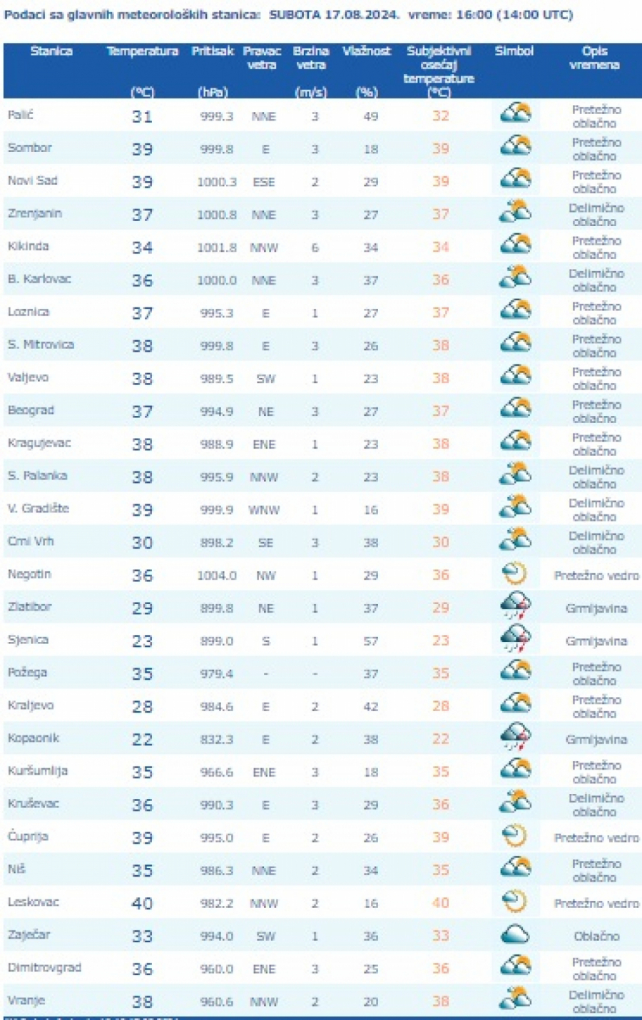 U Srbiji u nedelju promenljivo oblačno i dalje tropski toplo vreme, posle podne i uveče sa lokalnim pljuskovima i grmljavinom. Biće uslova i za grmljavinske oluje i nepogode.