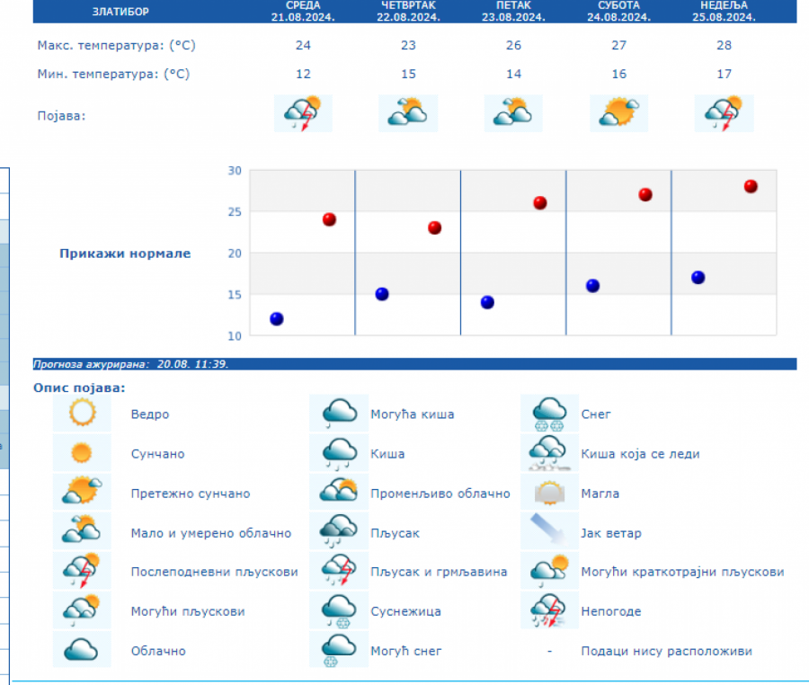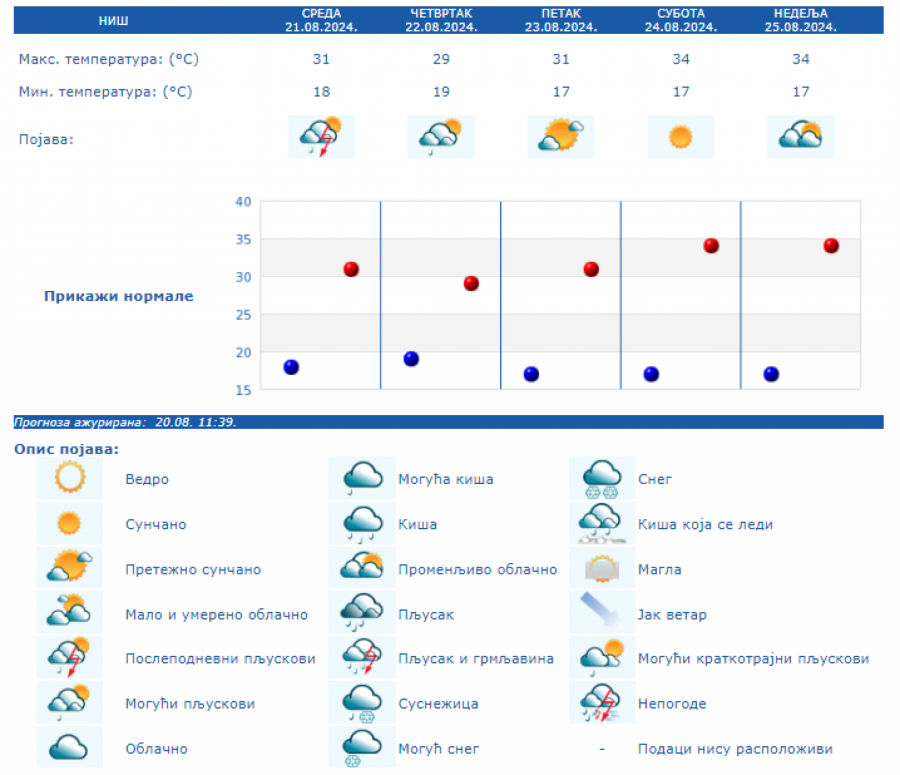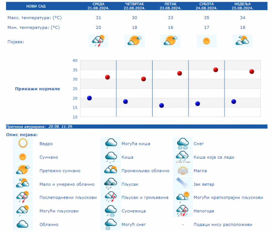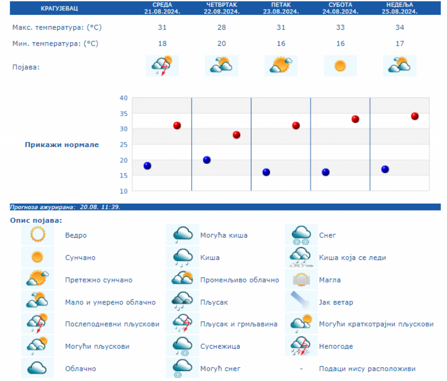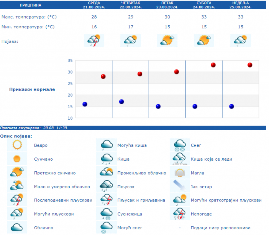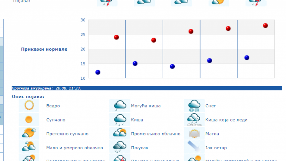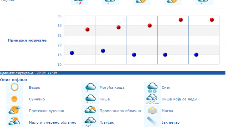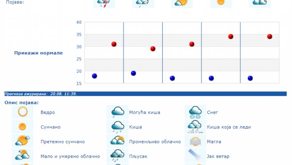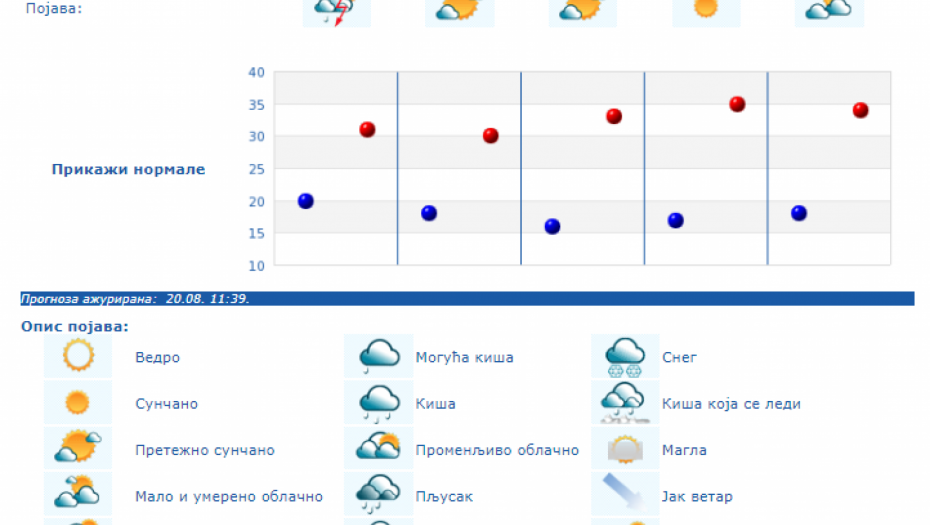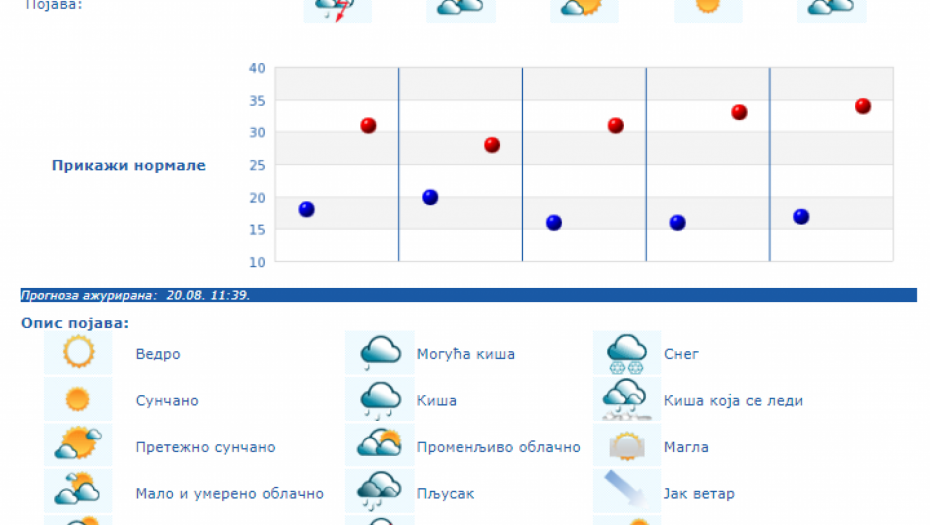 Pljuskovi će ponegde biti izraženiji i praćeni sugradicom i gradom, kao i jakim i olujnim vetrom, a temperature će se kretati od 15 do 34 stepena.