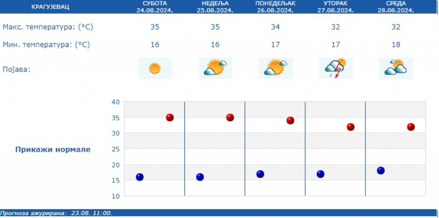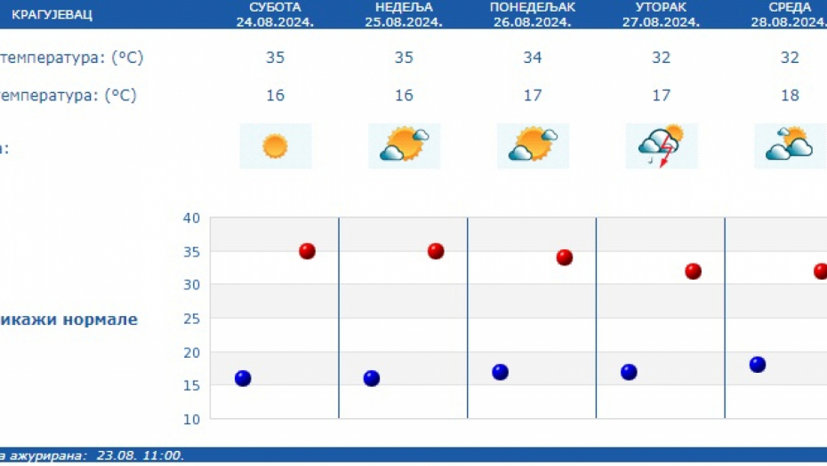 U utorak u svim krajevima, a od srede samo u brdsko-planinskim predelima uz promenljivu oblačnost očekuju se lokalni kratkotrajni pljuskovi sa grmljavinom.