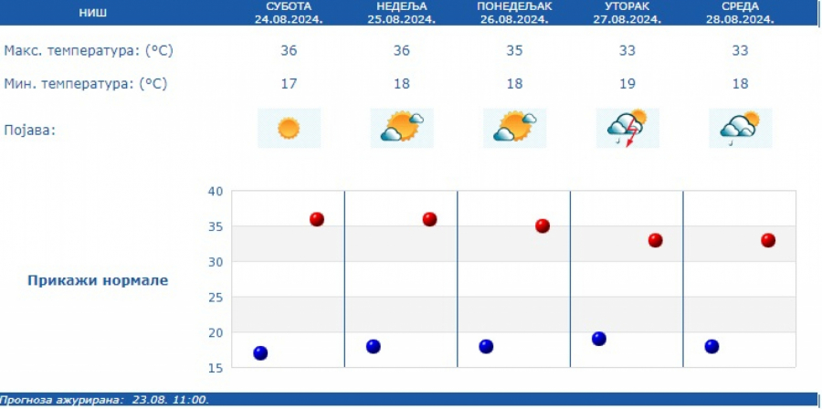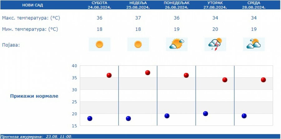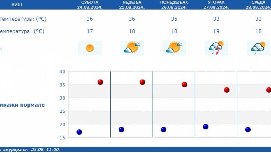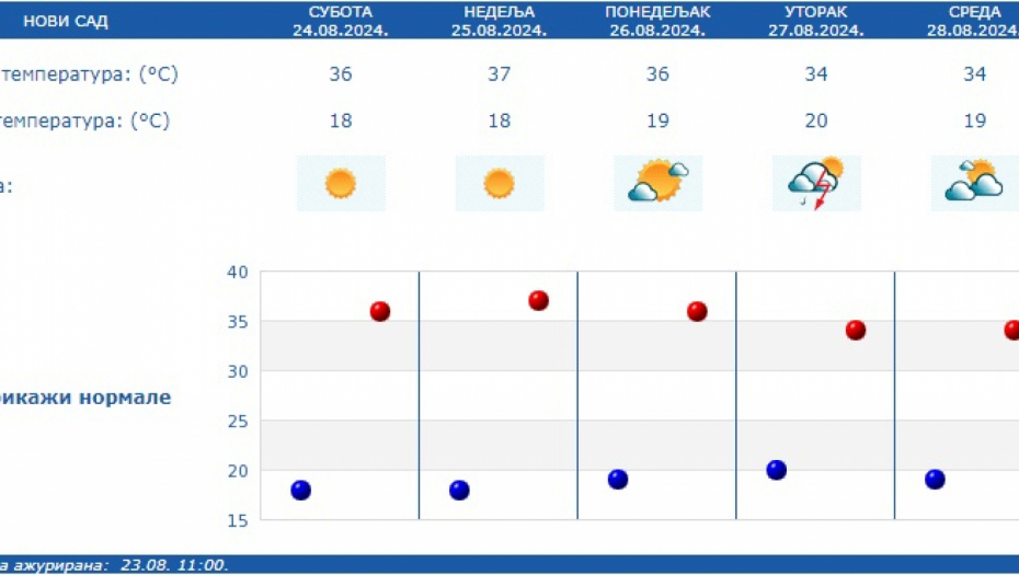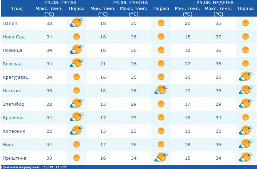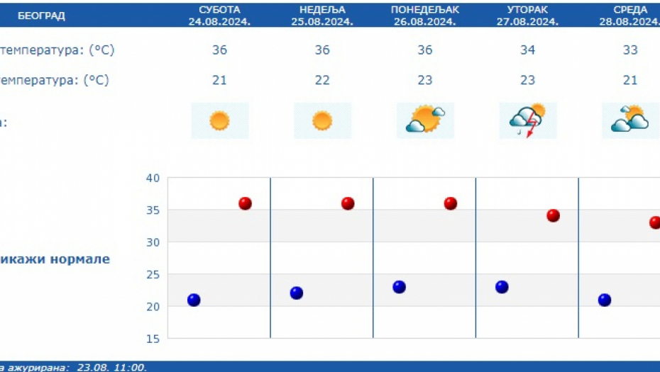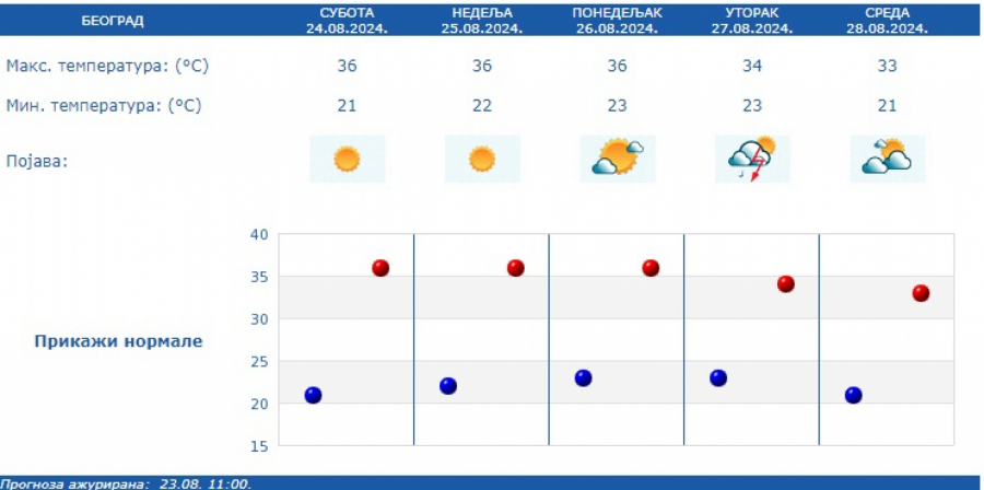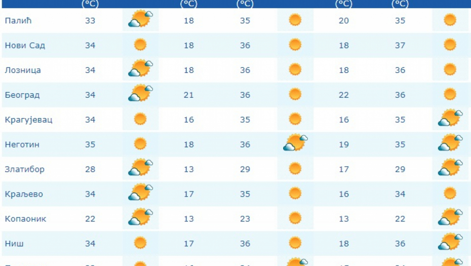 U Beogradu danas pretežno sunčano i veoma toplo. Vetar slab, promenljiv. Najniža temperatura od 17 do 21, najviša oko 36 stepeni.