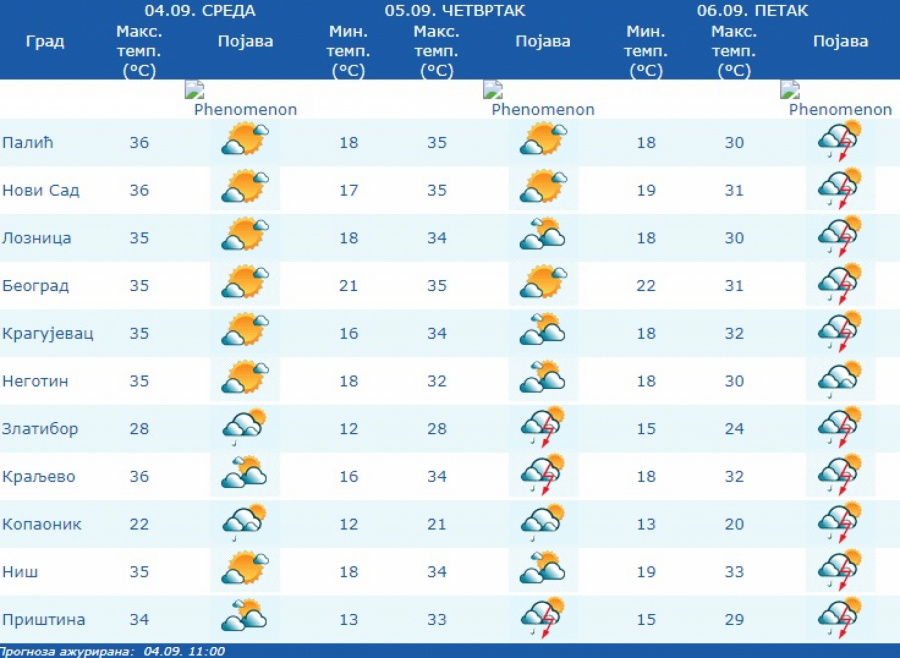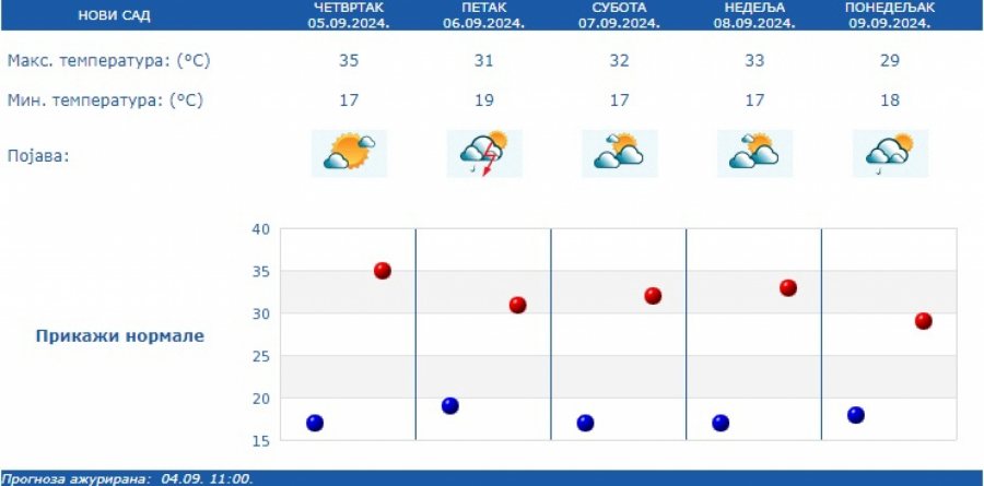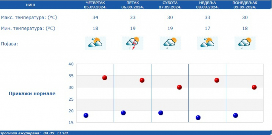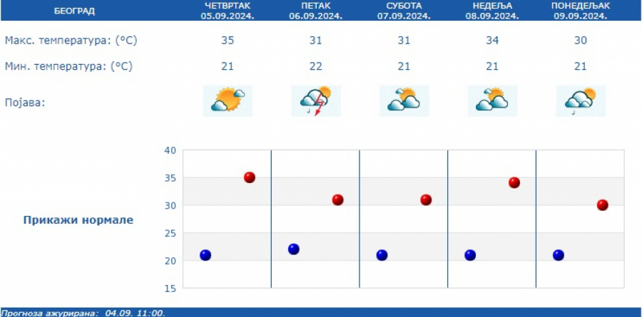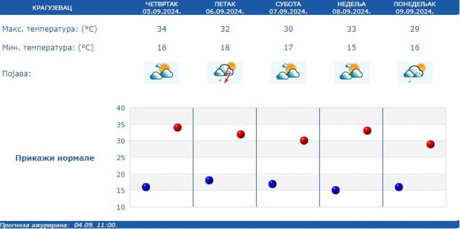 Prema izgledima vremena za narednih sedam dana, do četvrtka, 12. septembra, u petak 06. septembra promenljivo oblačno sa sunčanim intervalima, ali nestabilno pa se očekuju i lokalni pljuskovi sa grmljavinom.