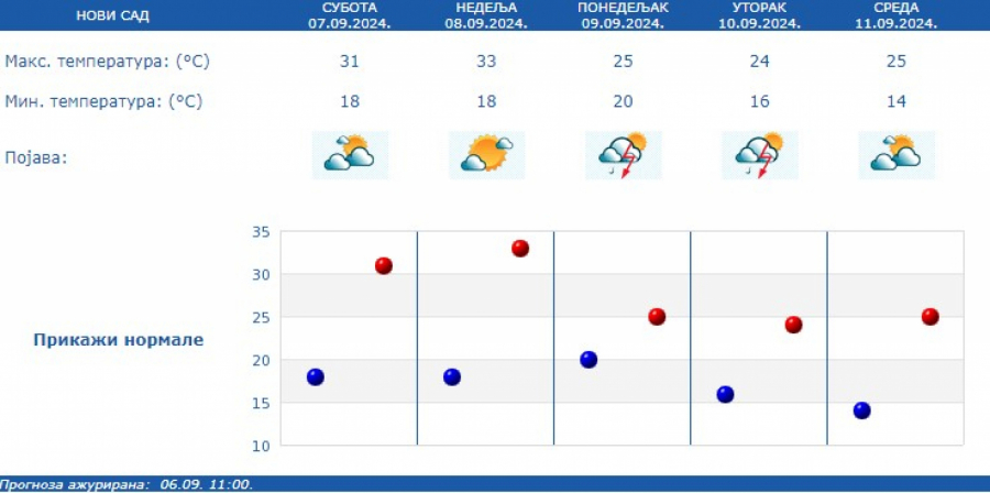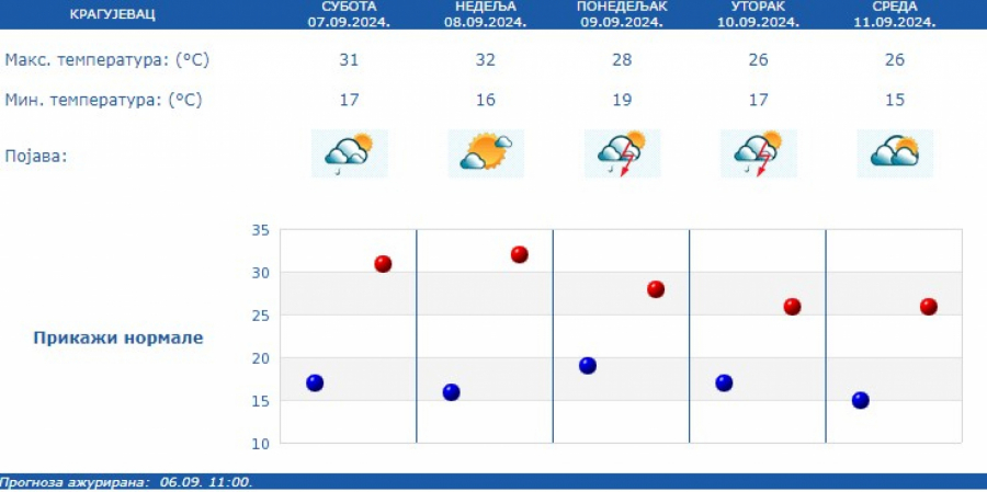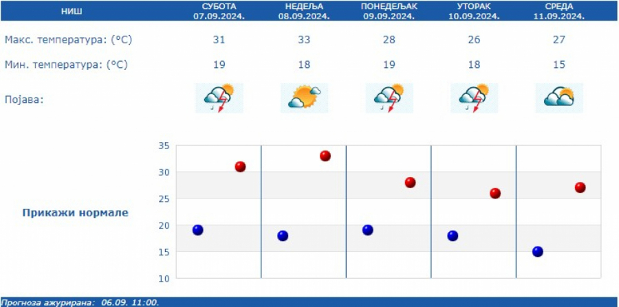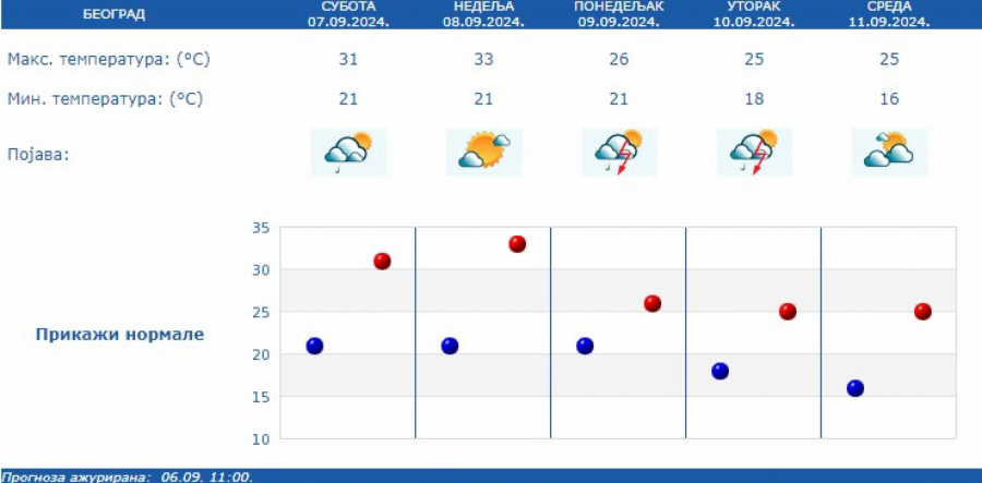 Prema izgledima vremena za narednih sedam dana, do 14. septembra, u nedelju će biti pretežno sunčano, sledeće sedmice promenljivo i nestabilno, mestimično sa kišom i lokalnim pljuskovima sa grmljavinom.