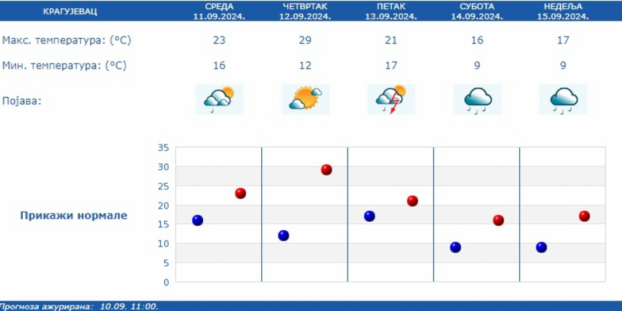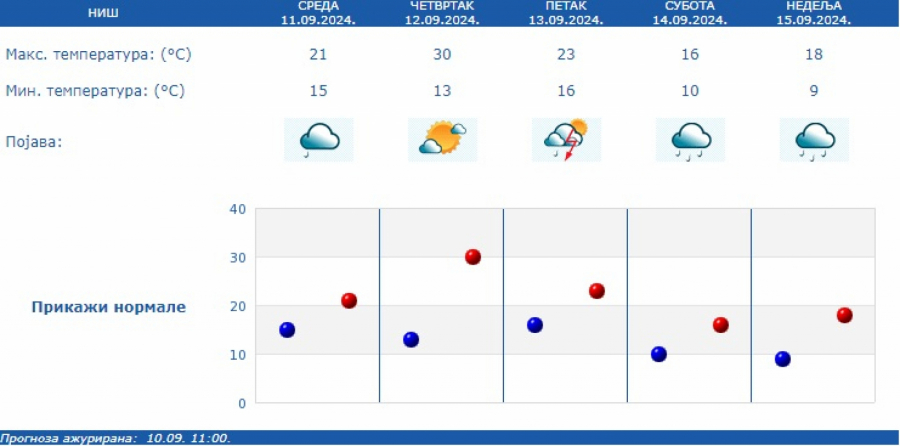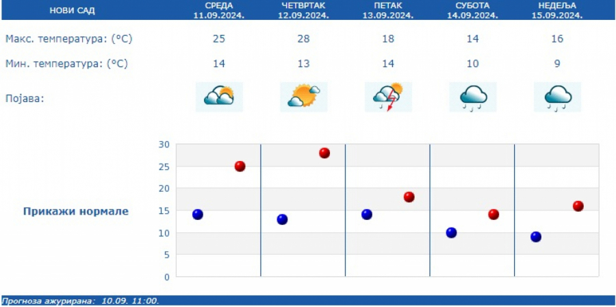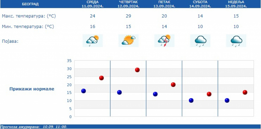 Očekuje se vetar slab do umeren severozapadni. Najniža temperatura kretaće se od 11 do 16 stepeni, a najviša dnevna od 20 do 26 stepeni.