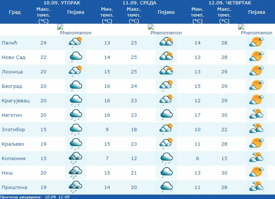Posle podne se očekuje prestanak padavina, uveče i razvedravanje. Prema prognozi Republičkog hidrometeorološkog zavoda (RHMZ), samo će u Bačkoj, Sremu, Mačvanskom i Kolubarskom okrugu biti promenljivo oblačno sa sunčanim intervalima i suvo.