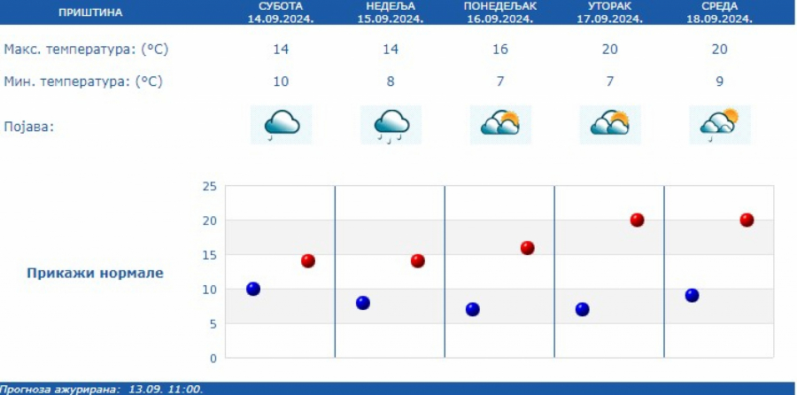 Vetar umeren zapadni i severozapadni, uveče u pojačanju. Najniža temperatura u glavnom gradu oko 10, najviša oko 14 stepeni.