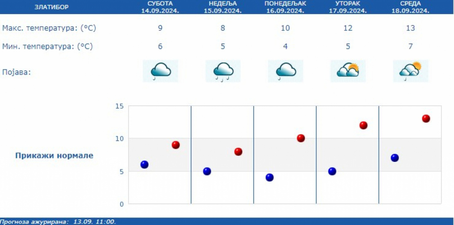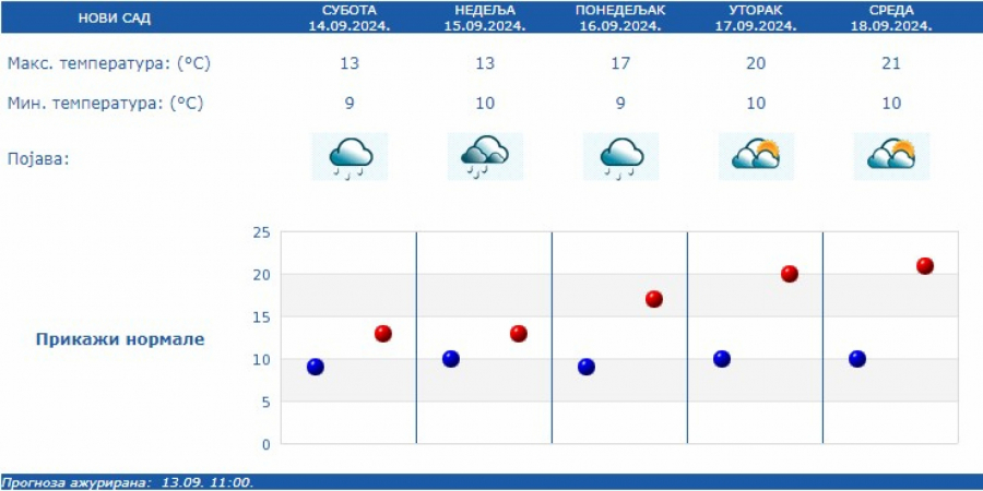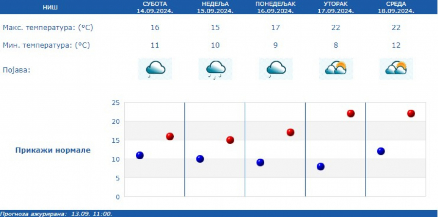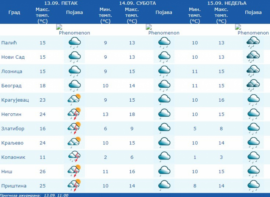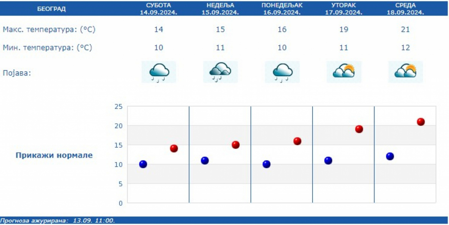 Oni ponegde na istoku i jugoistoku mogu biti praćeni i grmljavinom. Prema prognozi Republičkog hidrometeorološkog zavoda (RHMZ), najniža temperatura iznosiće od 8 do 13, a dnevna od 13 na severozapadu do 18 °C na jugoistoku i istoku zemlje.