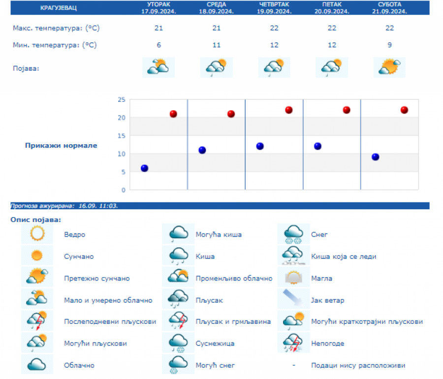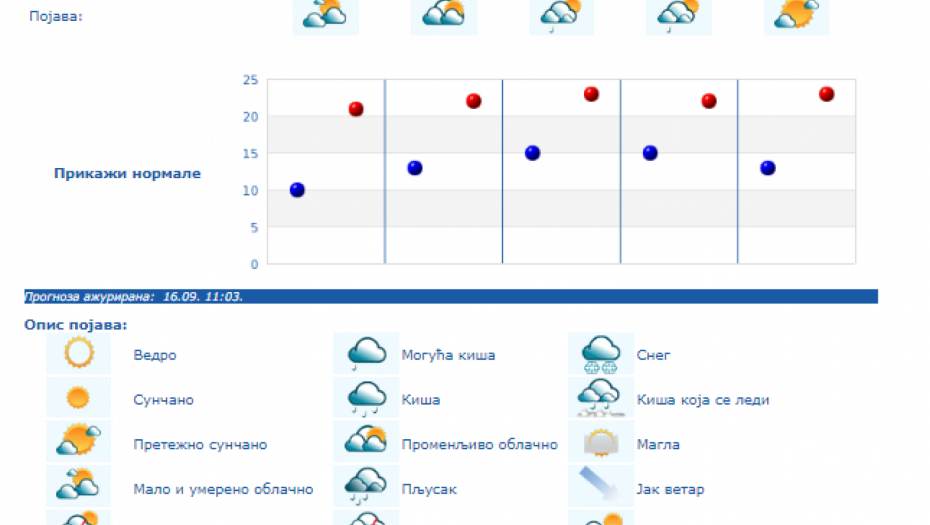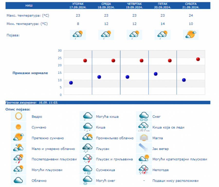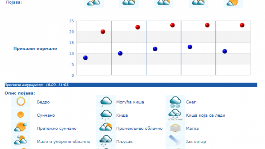 Najniža temperatura od 6 do 10, najviša od 18 do 23 stepena Celzijusa. U Beogradu sutra jutro hladno. Tokom dana promenljivo oblačno i suvo, sa sunčanim intervalima i toplije. Vetar slab i umeren istočni i severoistočni. Najniža temperatura oko 10, najviša oko 21 stepen.